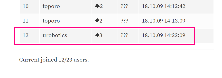 | 12 | urobotics | ♠️3 | ♠️4 | 18.10.09 14:22:09 |