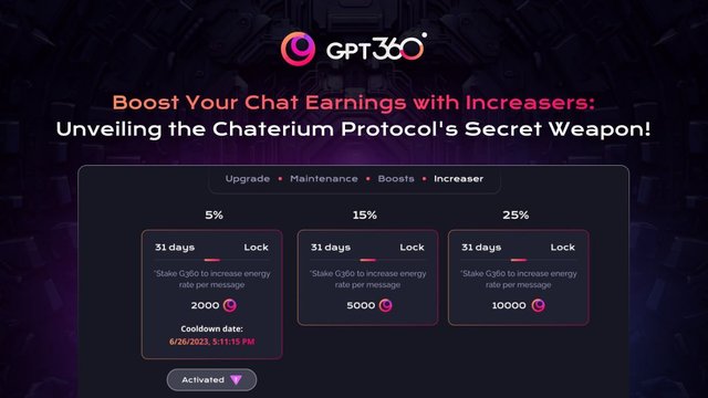 User Subscriptions for Chaterium Chat&Earn Feature: Users can subscribe to the Chaterium Chat&Earn feature using GPT360 tokens. This subscription provides an opportunity for users to earn rewards within decentralized communities even without owning an NFT. However, the gain rates may be lower compared to NFT holders, and certain specific features unlocked by NFT ownership may not be accessible.