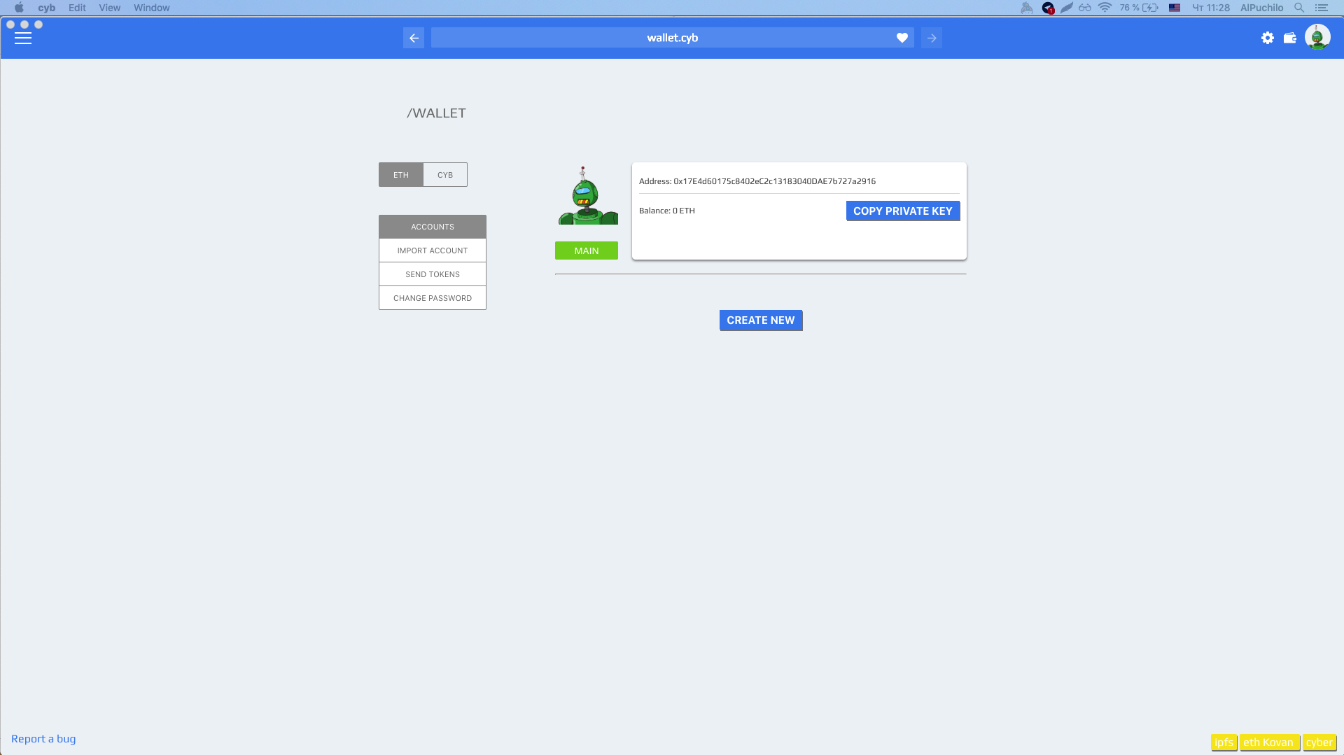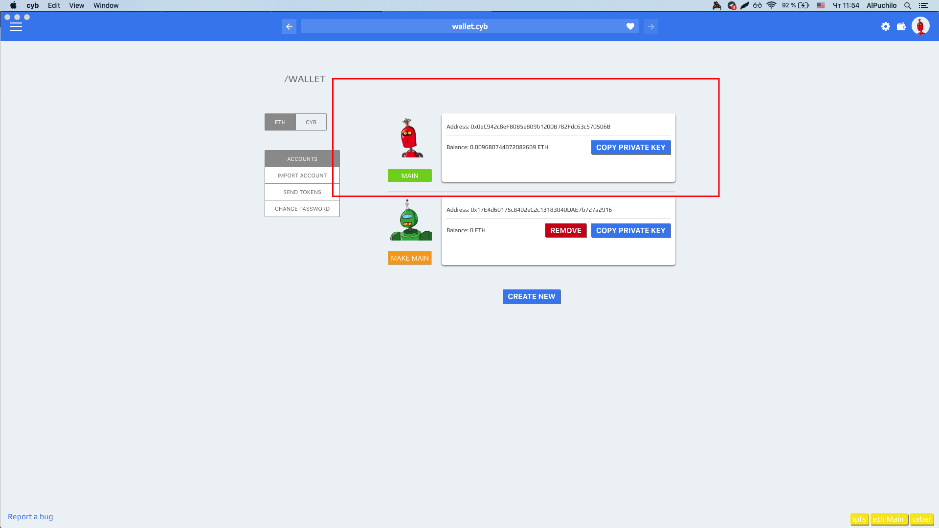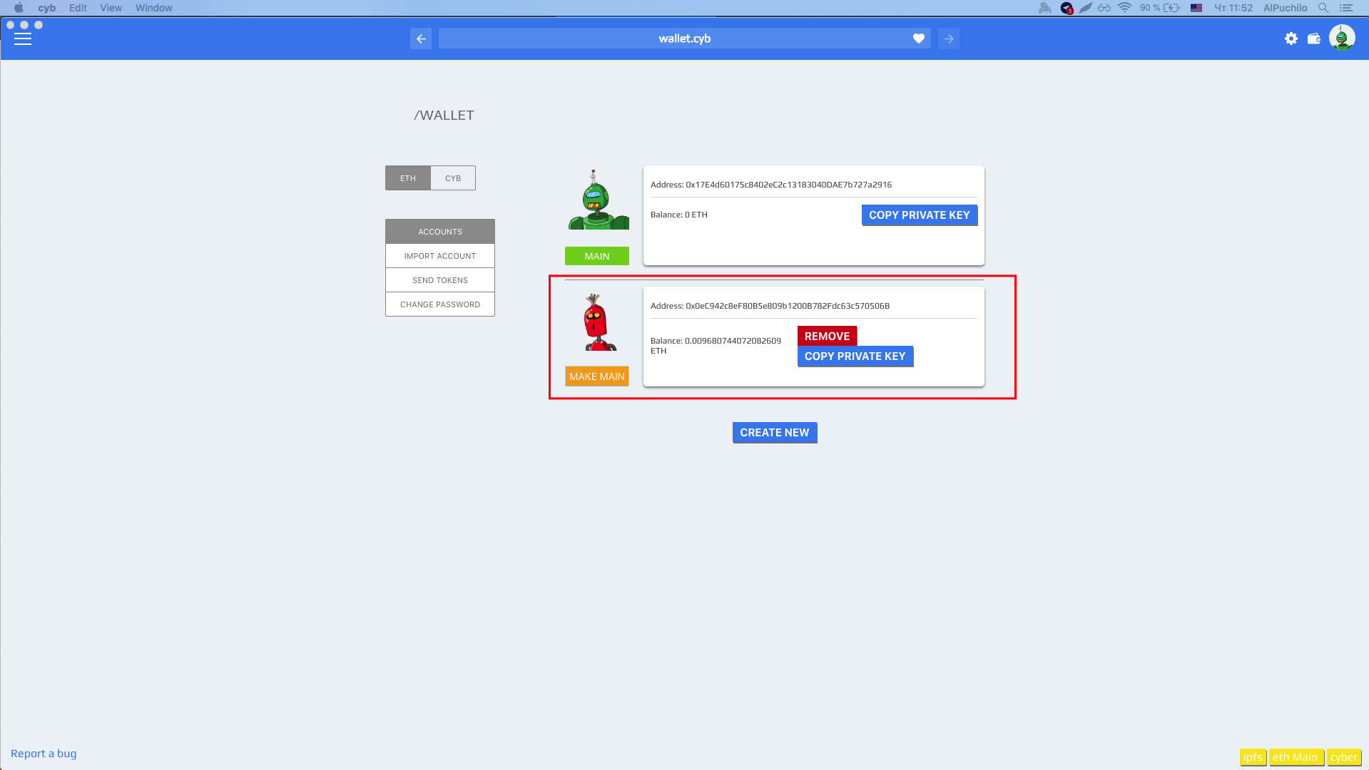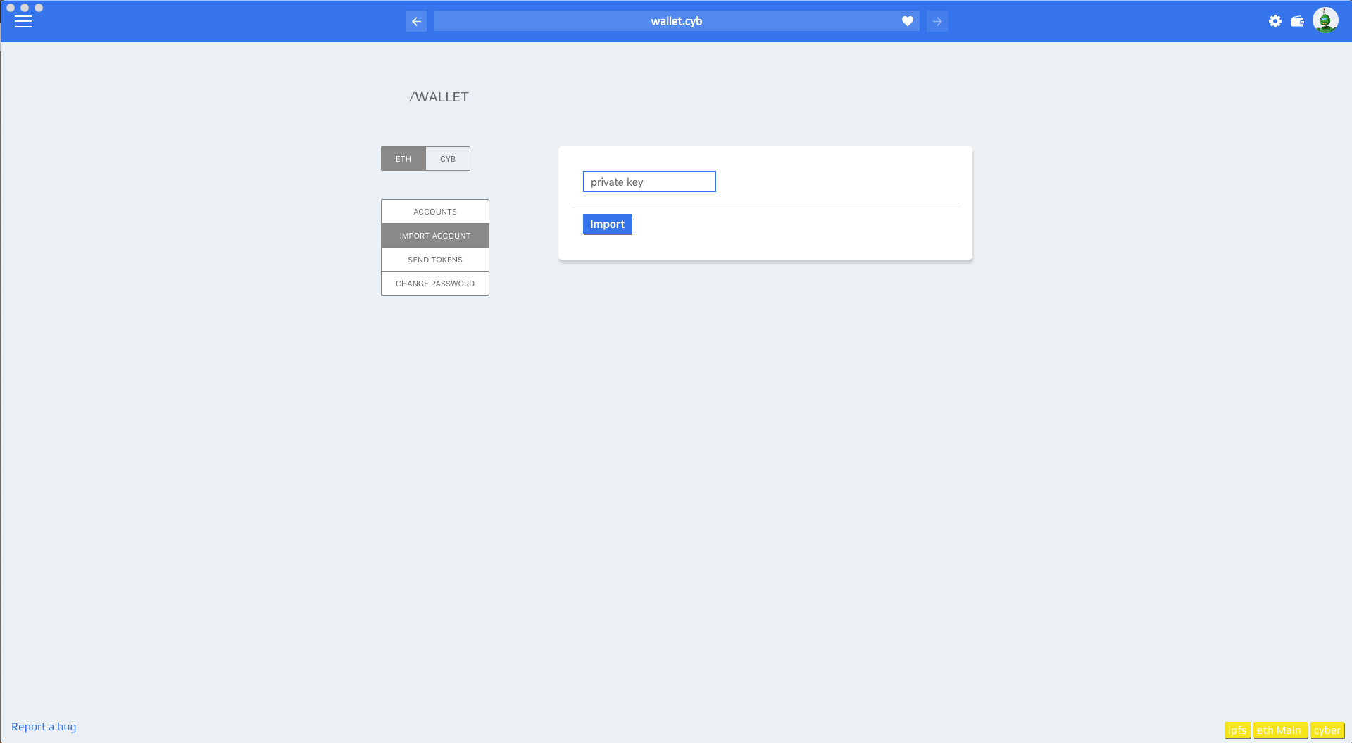 Cyb had created the ETH account already, but we want to import own account from metamask.