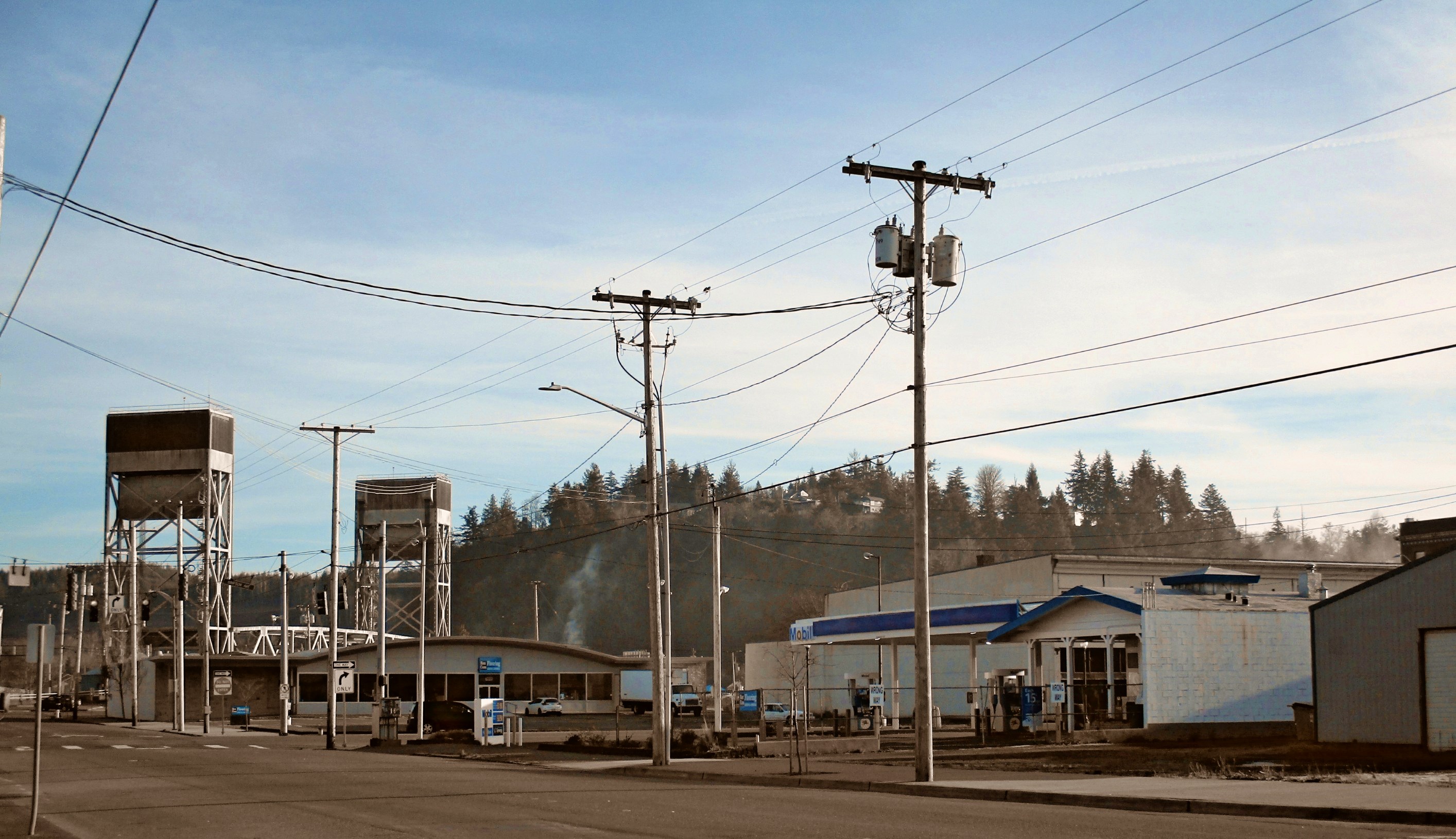 Hereʼs the full-color, uncropped version of that photo. Thatʼs Riverside Bridge on the Hoquiam River at left.