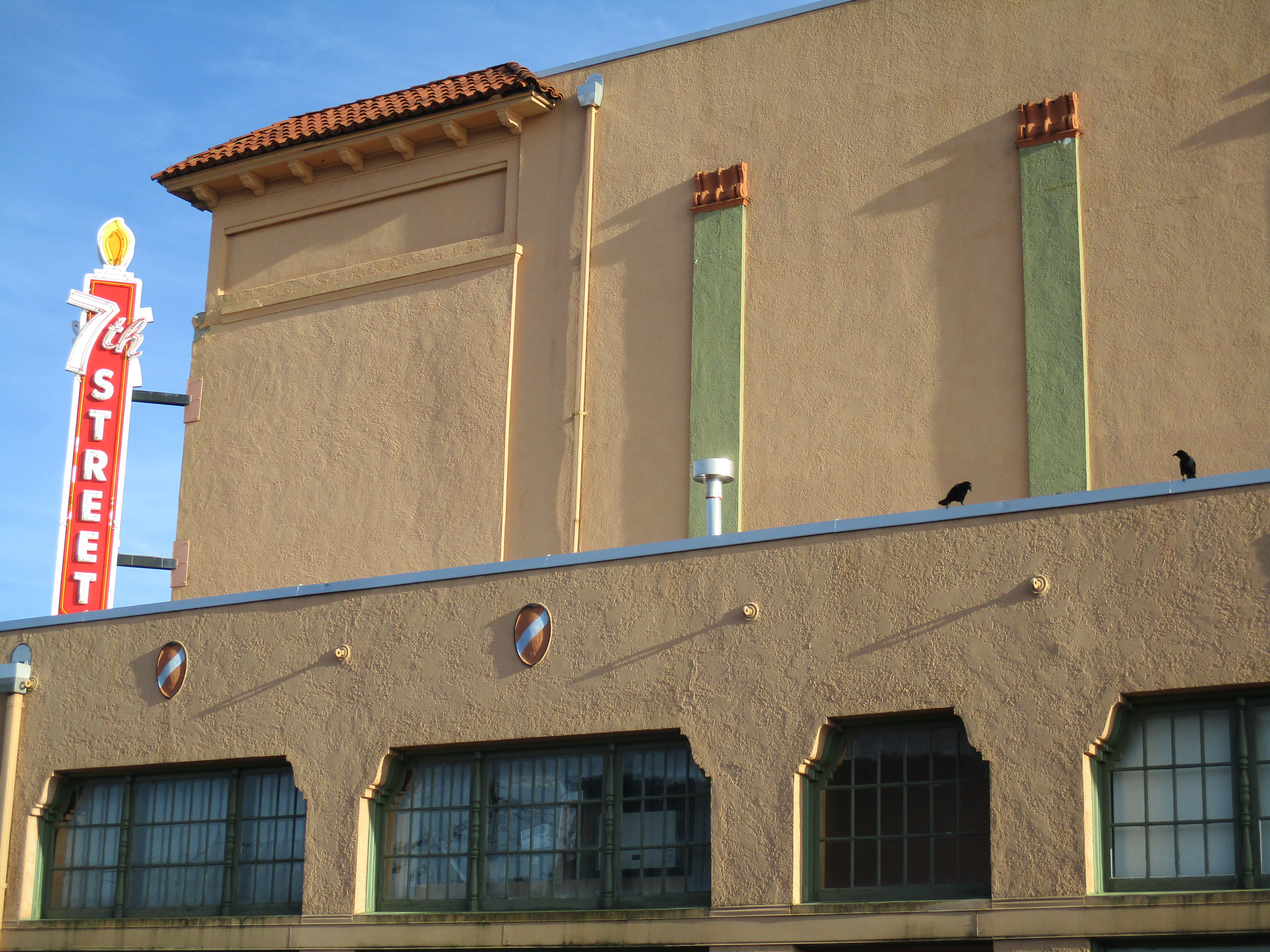 The 7th Street Theatre is listed on the National Register of Historic Places. It was built in 1928 and is in operation today, showing classic movies and staging musicals through 7th Street Kids. According to the theatre website, it is “one of the few remaining atmospheric-style theatres on the West Coast. The theatreʼs unique interior … transforms ... into a simulated open-air playhouse with a painted ʽskyʼ ceiling complete with clouds and twinkling stars.”