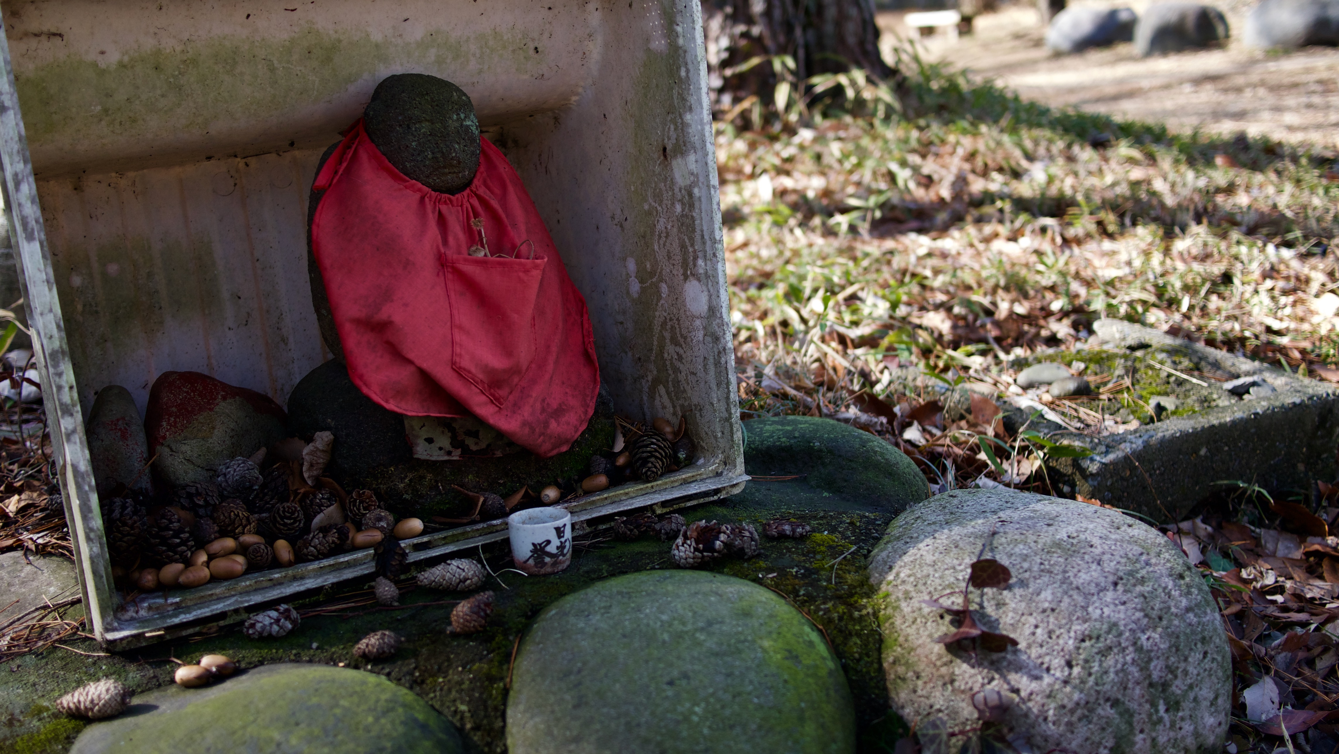 Jizo is a Japanese deity who protects children and travelers. People in Japan set up small shrines for Jizo along hiking and walking trails (and near playgrounds, cemeteries, and just about everywhere else either a child or a traveler might happen to be); this small shrine appeared over the winter. Visitors have left some pinecones, acorns, and a bit of sake for the deity.