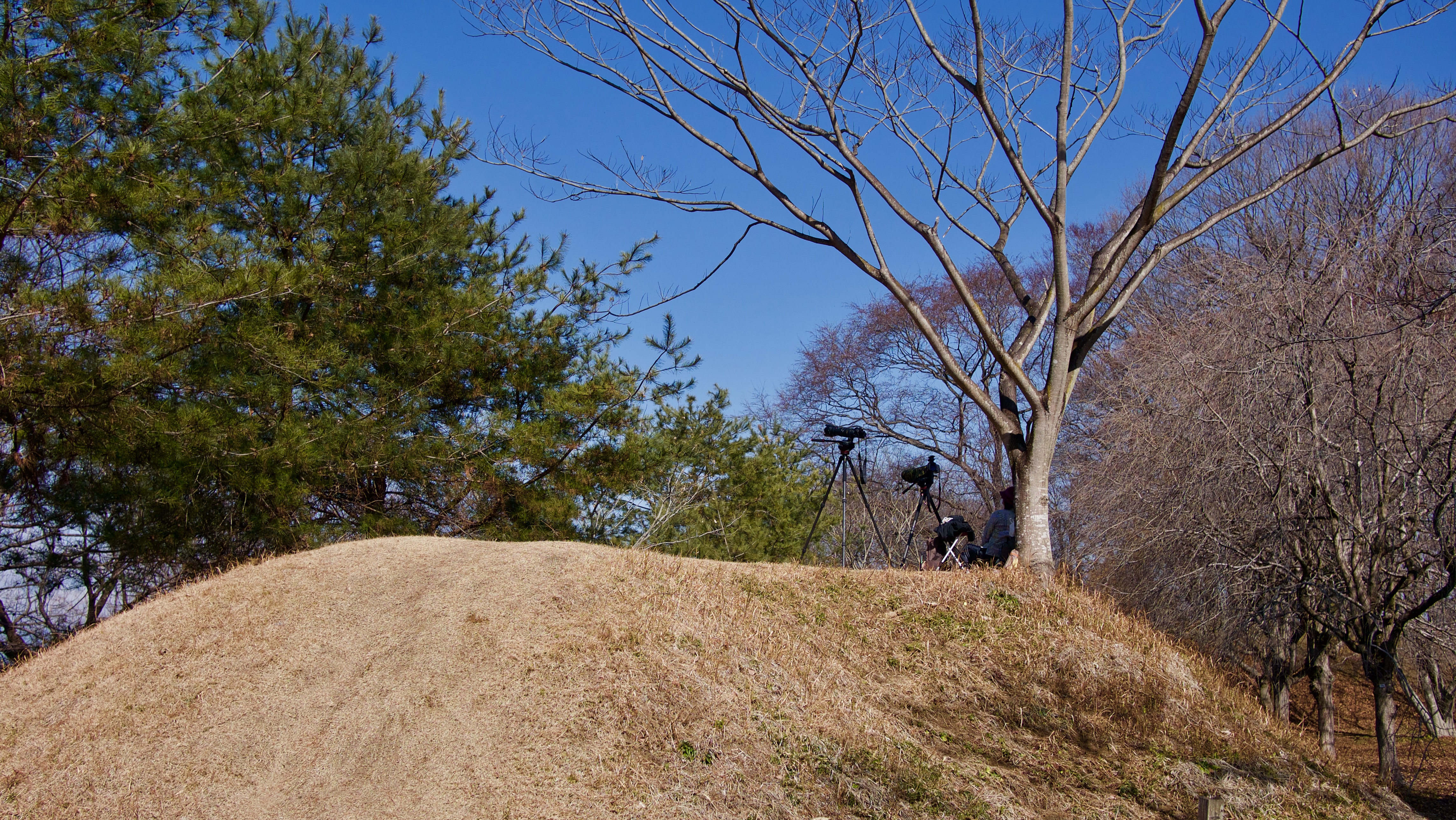There's a photographer hiding just under the tree at the top of the hill. She said she was hoping to catch a glimpse of some birds that nested in the trees in front of her.