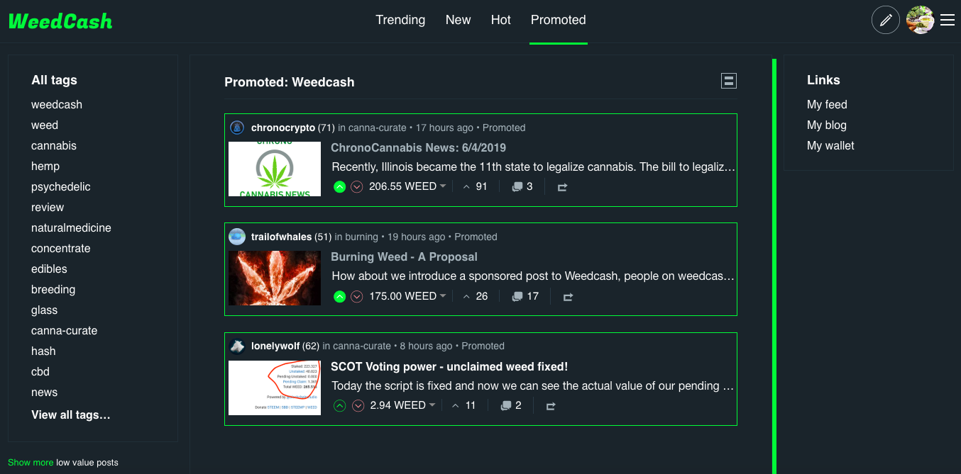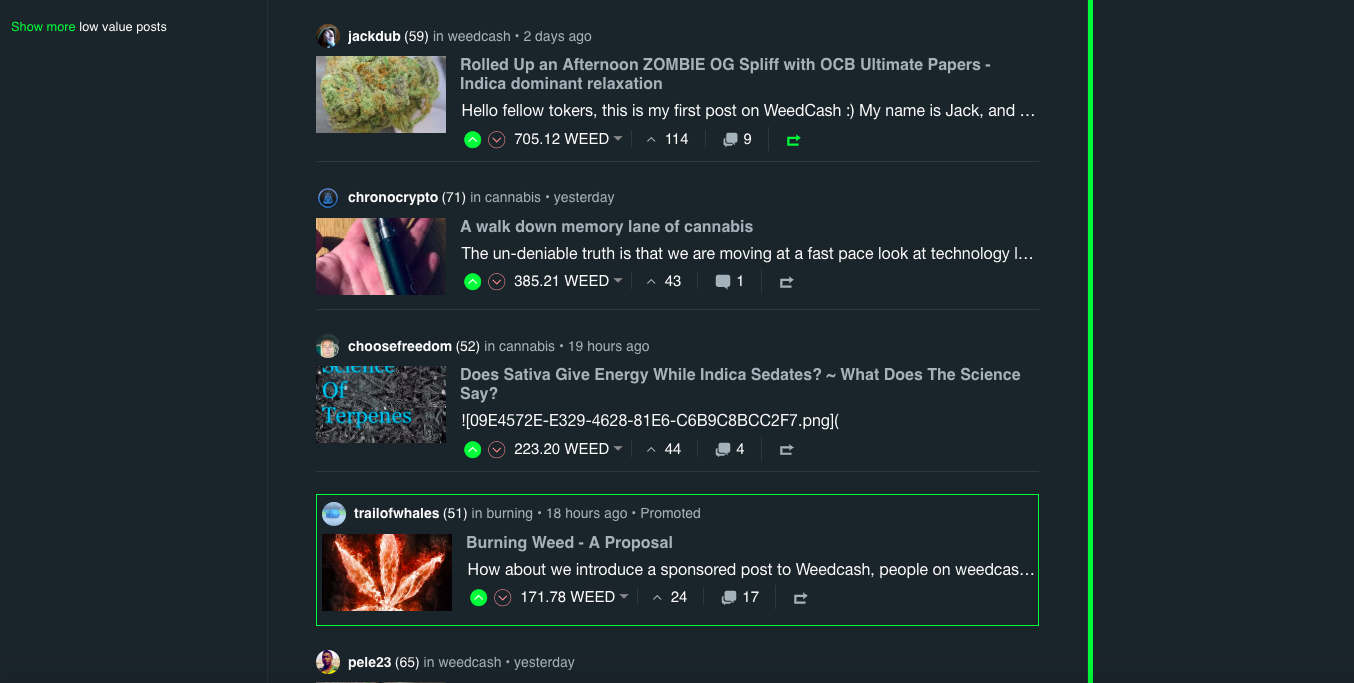 button on the bottom right of a post, you can now enter WEED bids that will promote the post to the trending page. - The top bid gets the top spot and lower bids are interleaved through the trending and hot pages every five posts.