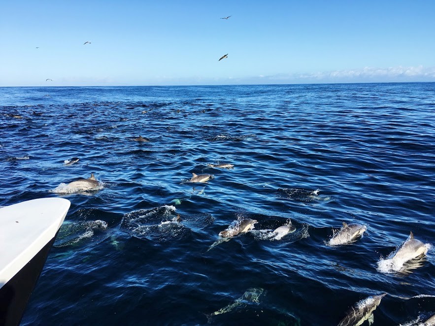 Cameras ready, the conversation with the experts on board centered around this breath-taking marine mammal – the Humpback Whale. It is a species of Baleen Whales. It normally weighs around 25-30 metric tons and is 12-16 meters long. The expected lifetime is around 45-50 years. They are found near the coastlines when not migrating. While all this banter and chit chat was going on over a cup of coffee, we witnessed a Pod (or shall we say a Superpod) of Dolphins racing our vessel in front of us. It was a mesmerizing picture.