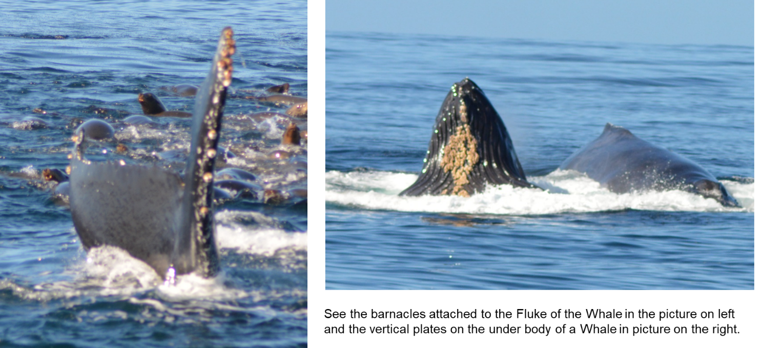 Barnacles are Shrimp like animals standing on their heads. The attach themselves to Whales and live off it. In the pictures above you see small objects attached to the skin of the Whale. These are Barnacles. They attach themselves in large numbers but in relative terms, they are insignificant given the overall weight of Whale – say about 1000 lbs out of a weight of Whale which is probably in the region of 80,000 lbs.