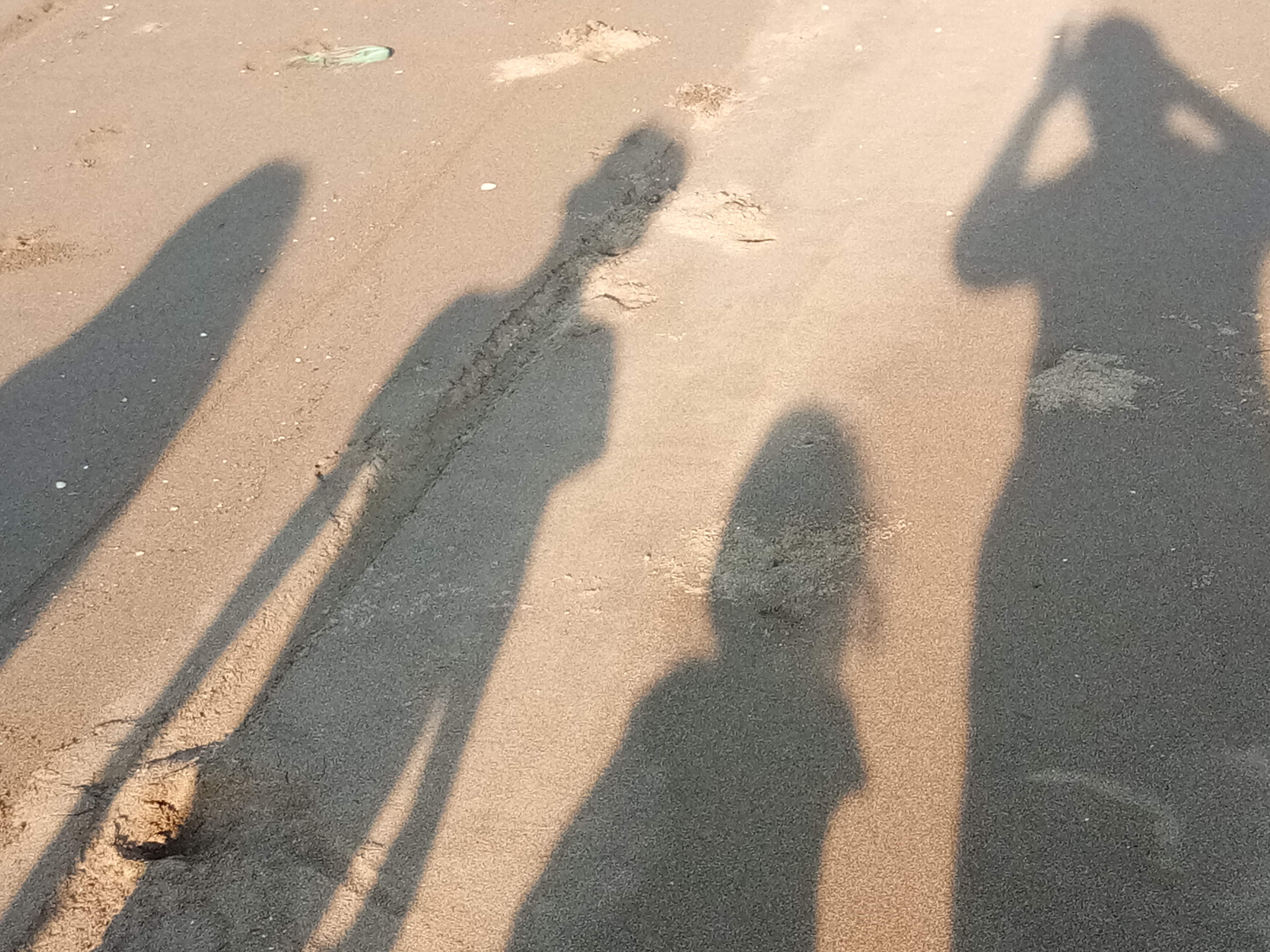 Bayangan kami tergambar jelas di pasir pantai, hari ini memang gerah.