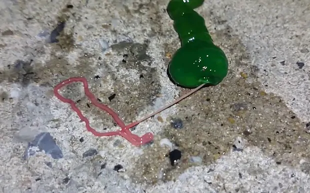 A man encountered this green jelly-like ribbon worm, or Nemertea, while fishing in the port of Penghu in Taiwan (pictured below). It has a proboscis, or feeding tube - the pink ribbon seen here - which it ejects while hunting. The proboscis secretes a mucus-like substance that paralyses its prey. Nemertea usually live underwater in tropical regions, but are also known to inhabit cool, damp terrestrial areas. They are also undoubtedly disgusting.