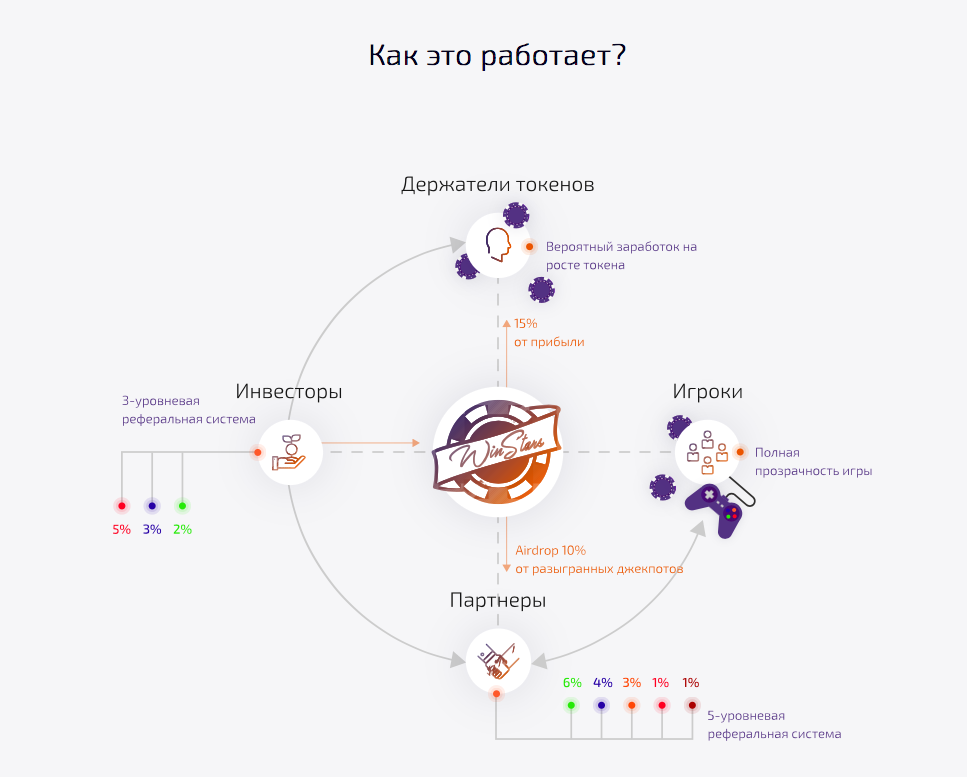 Продолжаем серию статей о проекте Winstars – первом децентрализованном казино на платформе блокчейна. Недавно они провели свою первую конференцию d10E в Тель-Авив, где успешно презентовали себя, сегодня будет встреча адвайзеров и добавление двух новых игр на платформу в течение недели. Проект расширяется. А так же они добавят казино с виртуальной реальностью в этом году. Представляете, вы одеваете очки и попадаете в казино, где вокруг вас такие же люди, вы видите карты, фишки и главное, вы прозрачны все алгоритмы определения победителей. Вы точно знаете, что все выплаты будут, вас не заблокируют, вероятность выигрыша известна. Плюс вы можете получать хороший доход, если будете просто держать токены на кошельке у себя. 10% от джекпота казино и 15% айдропом раз в месяц. Отличный пассив! Вы просто так получаете доход от ваших токенов.