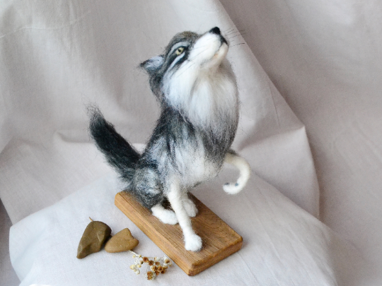 Handmade felted wolf figurine by artist from natural sheep wool, horse hair and cedar wood. Do not contain plastic, only natural high quality supplies.
