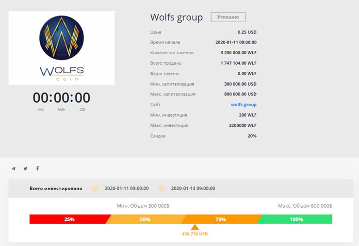 Как можно увидеть на слайде, всего за 4 дня с 11 по 14 января 2020 года было продано 54% от всех запланированных токенов WLF на 436 000$, что говорит об интересе пользователей биржи к этому проекту.