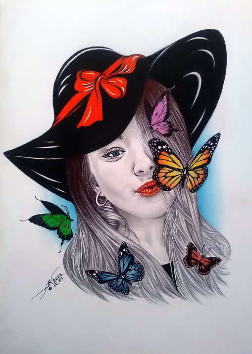 The portrait is made with a black pen and colored pencils.