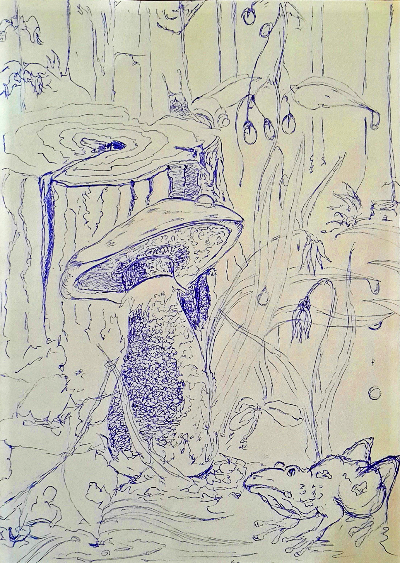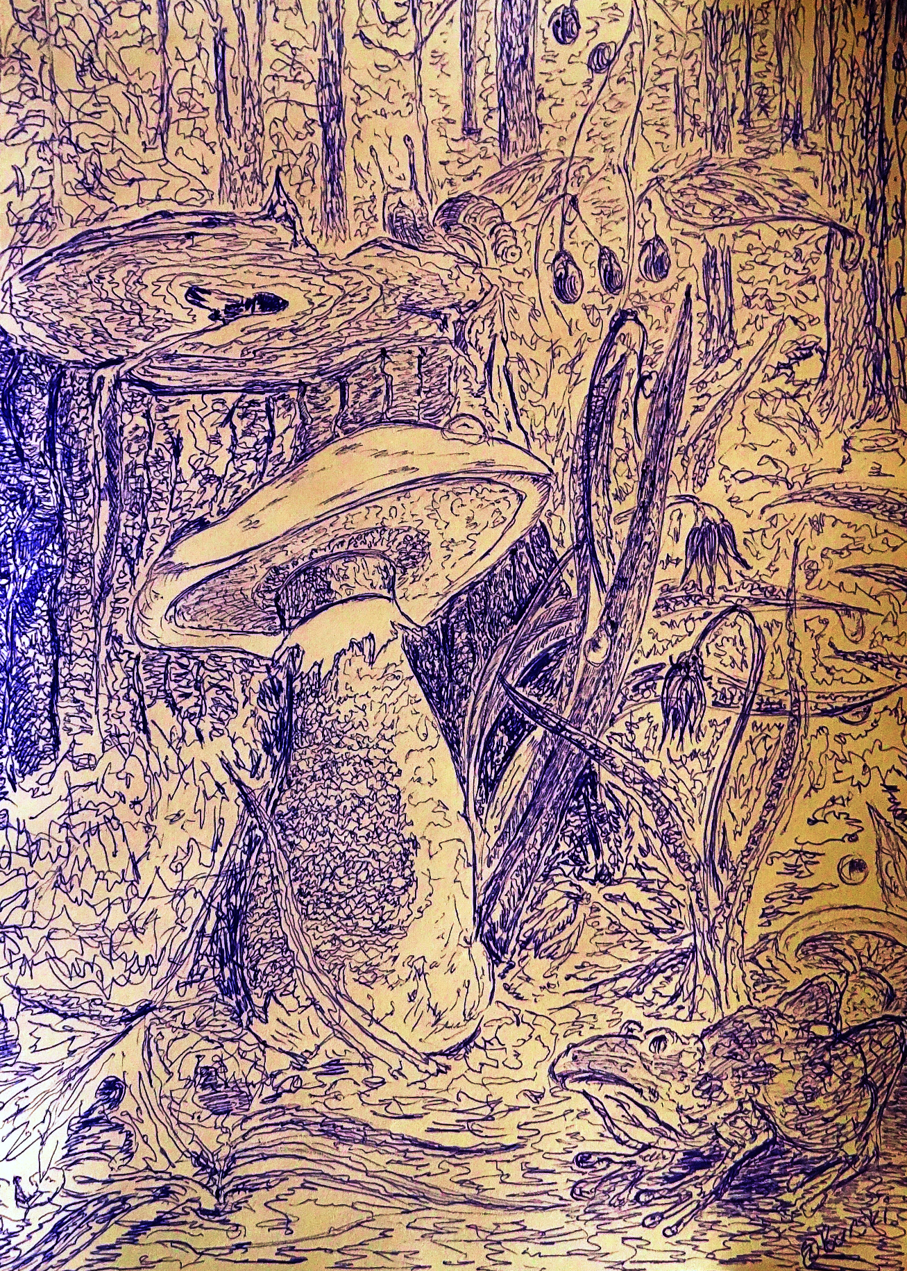 All elements of the drawing are invented, more precisely, created from memory and, therefore, I did not attach any importance to the authenticity of plants and animals, I never use other people's drawings and photographs as a model only your memory.