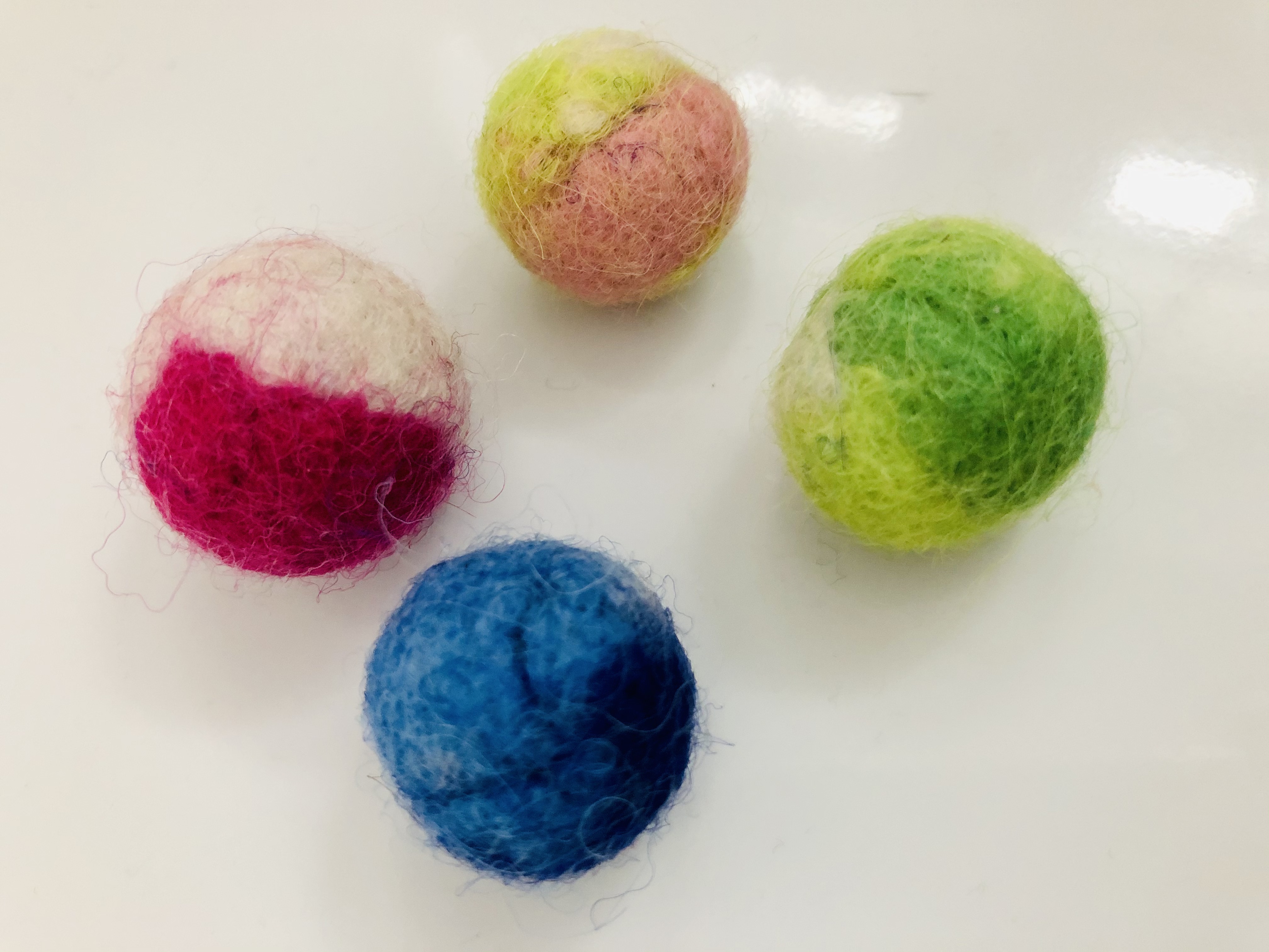 I made these woollen balls using a technique of soap and strands of wool, mixing the colours together and rolling until they are beautifully round like marbles. The green one looks like a Brussels sprout.