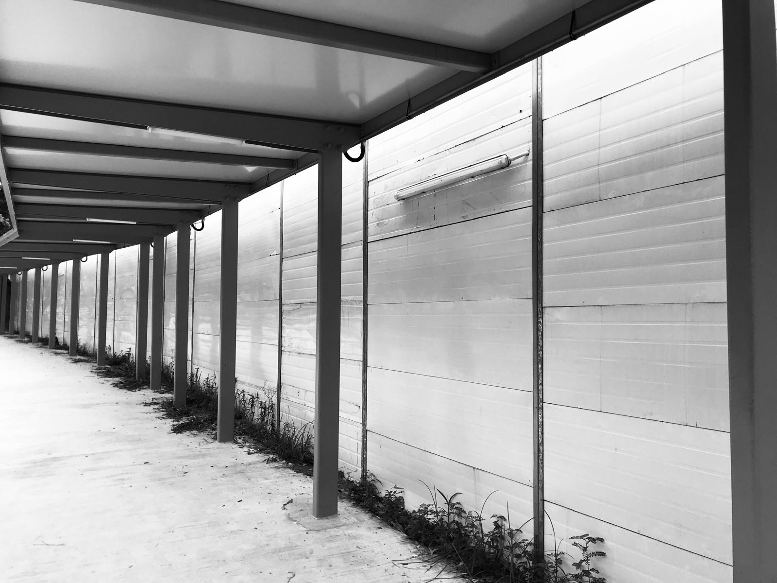 - Subject: A covered walkway with supporting columns, adjacent to a solid wall.