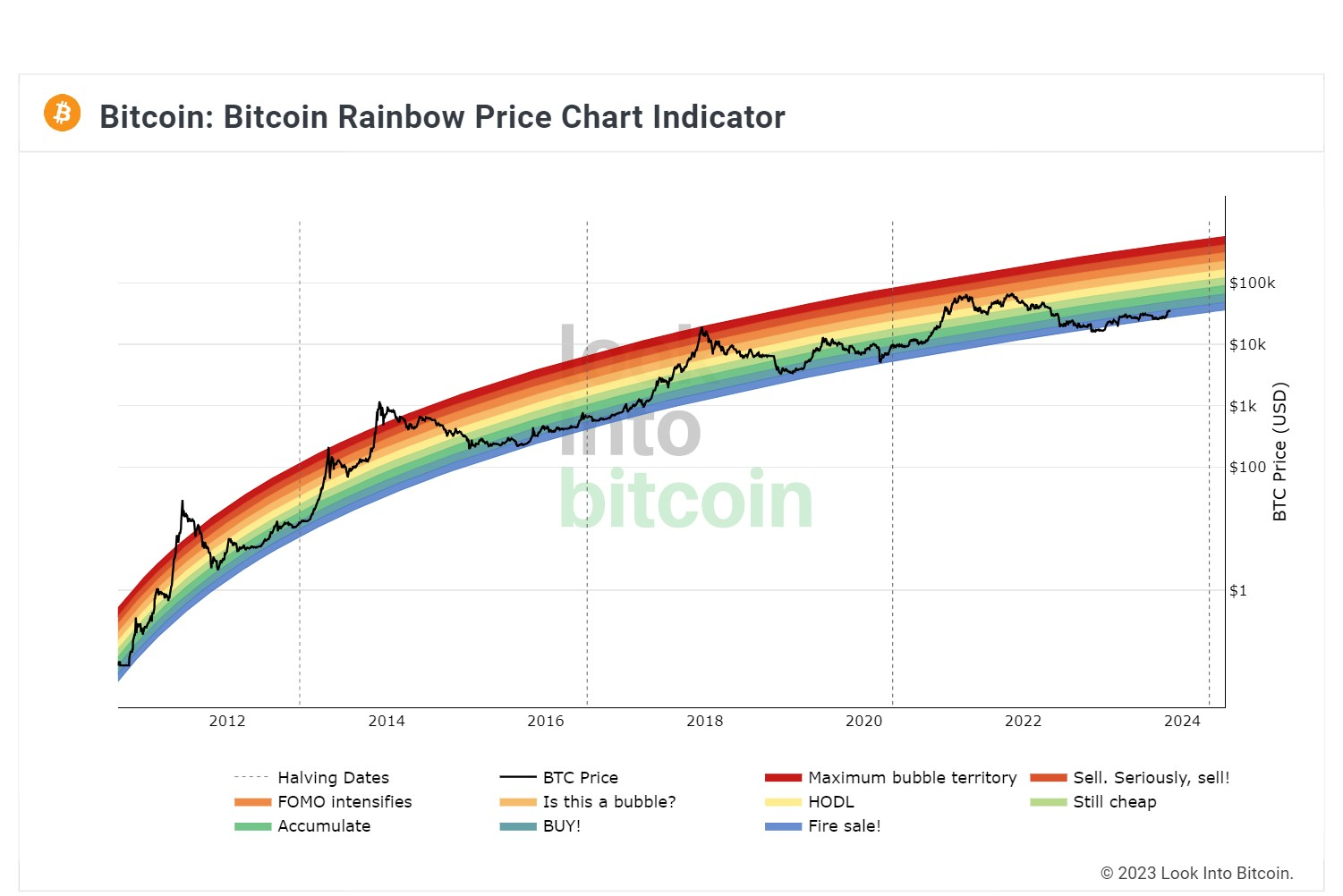 The strong trend in Bitcoin continues. The expectation that Blackrock's Spot EFT application will be approved in the USA keeps the market alive. Historical data shows that Bitcoin is in an exponential uptrend. Therefore, Bitcoin does not need the support of any regulatory agency to rise. The bear market lasted for a long time because liquidity conditions were unsuitable. If crypto did not have cycles and the increase was more evenly distributed over the years, Bitcoin price should have been close to 100k. The yellow band in the chart below shows the expected value of Bitcoin.