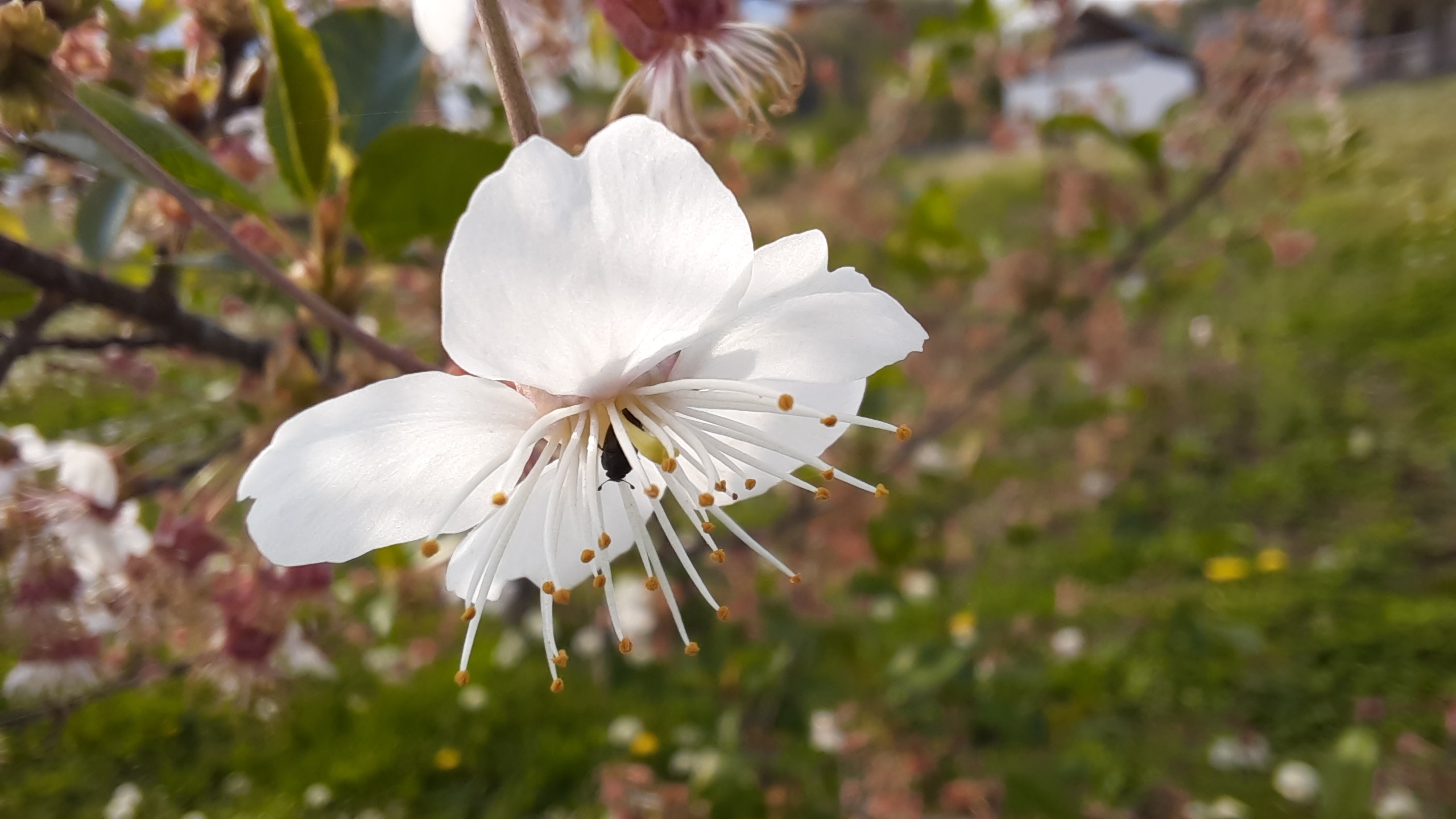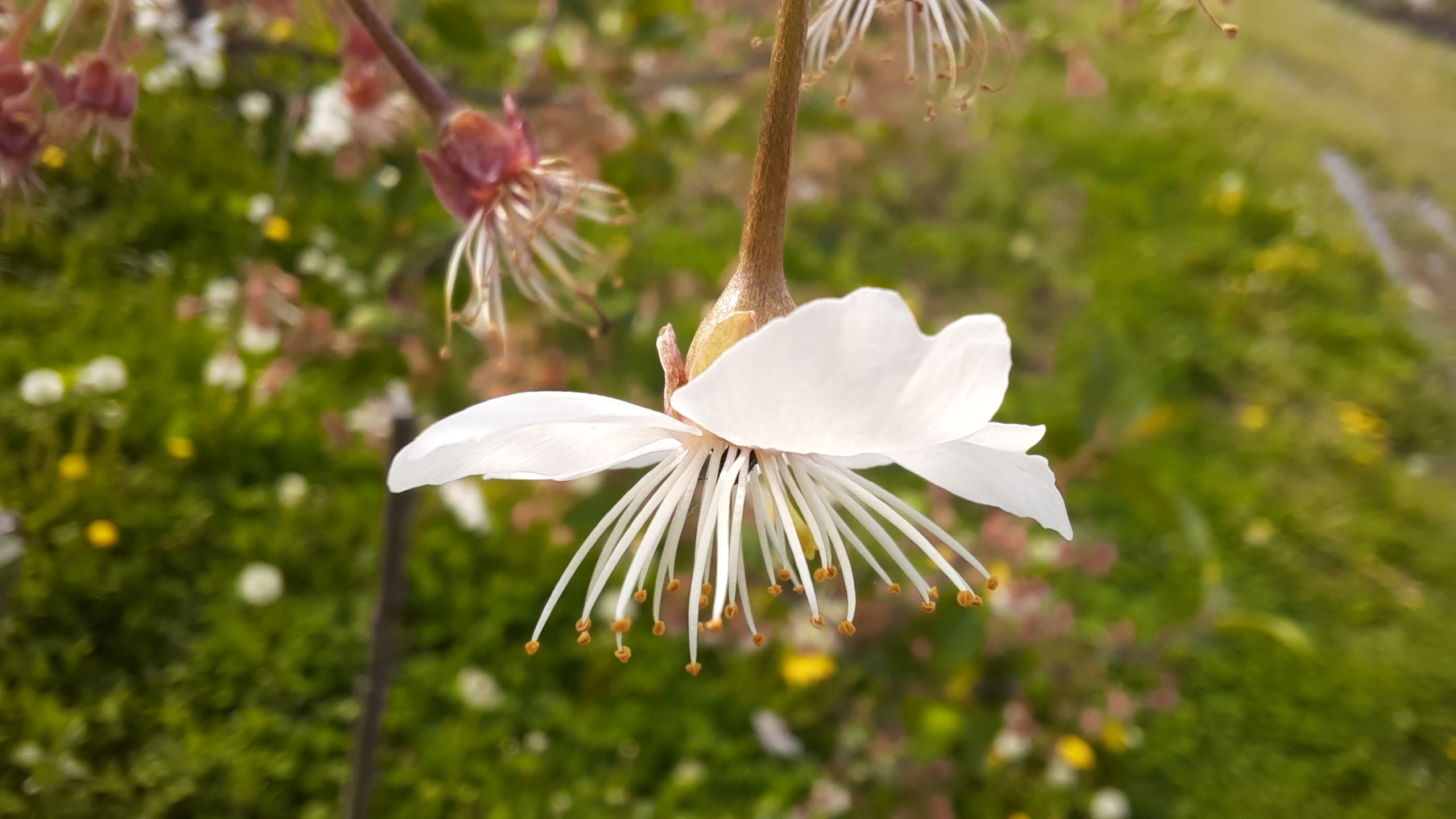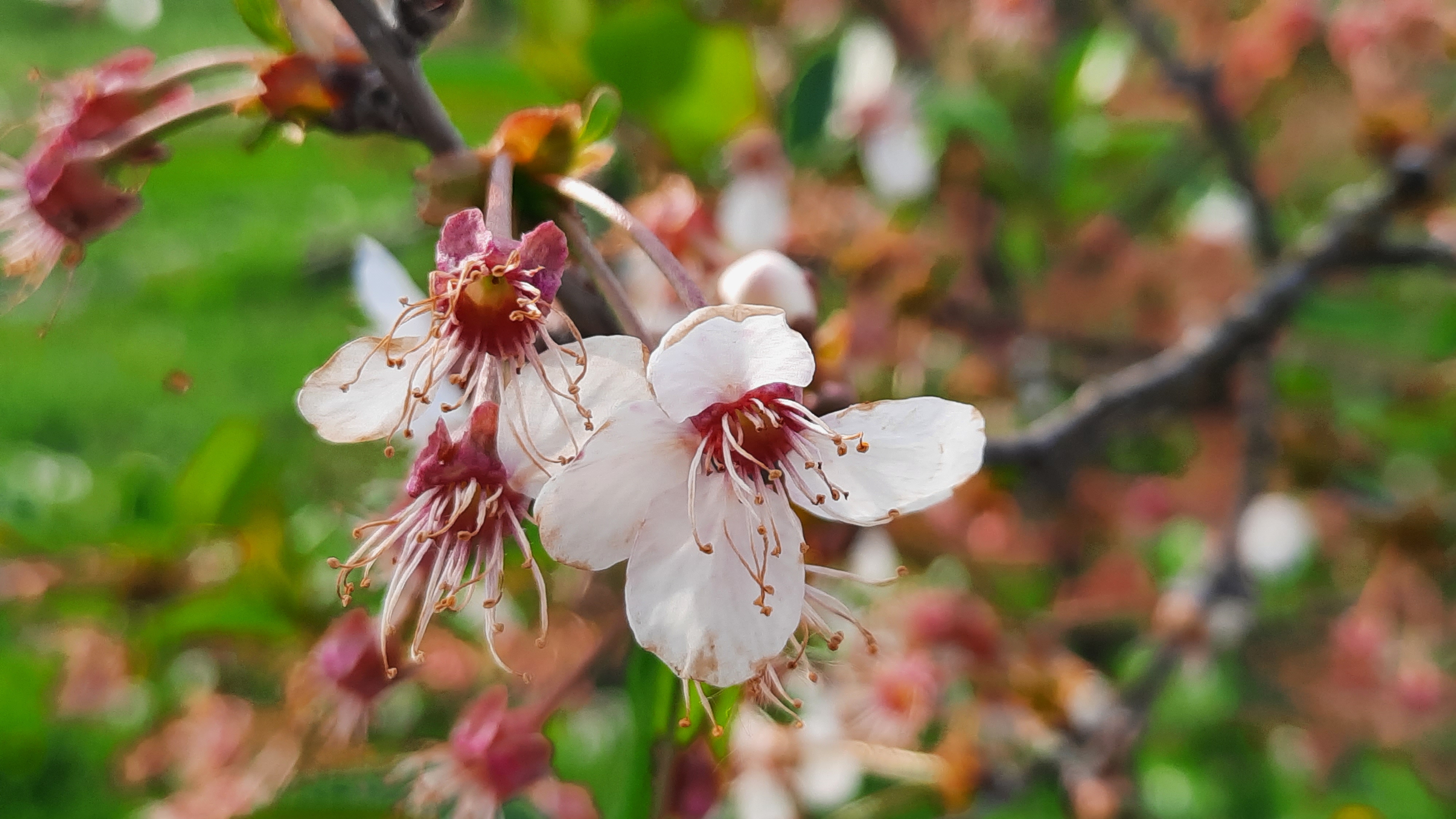 Cherry blossom is almost finished. Maybe some flowers left on the cherry trees. Most of them lost its petals and have some stamens that are going to dry. But some of the flowers are still there so I took some photos. We can see cherry flowers and dry flowers that have only stamens left.