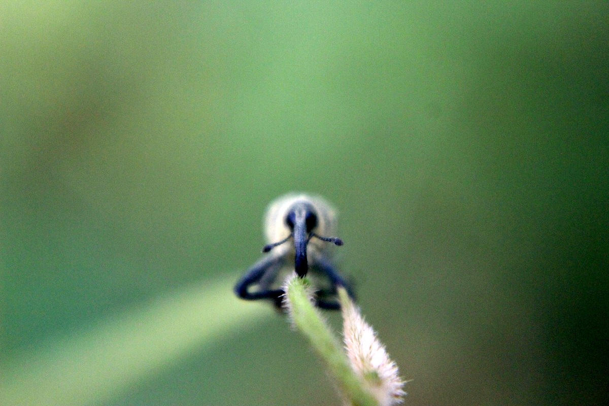 in this first picture, you can see, the face of the elephant's proboscis beetle, which I photographed, from the front, while walking on a tree branch, which has fine hair.