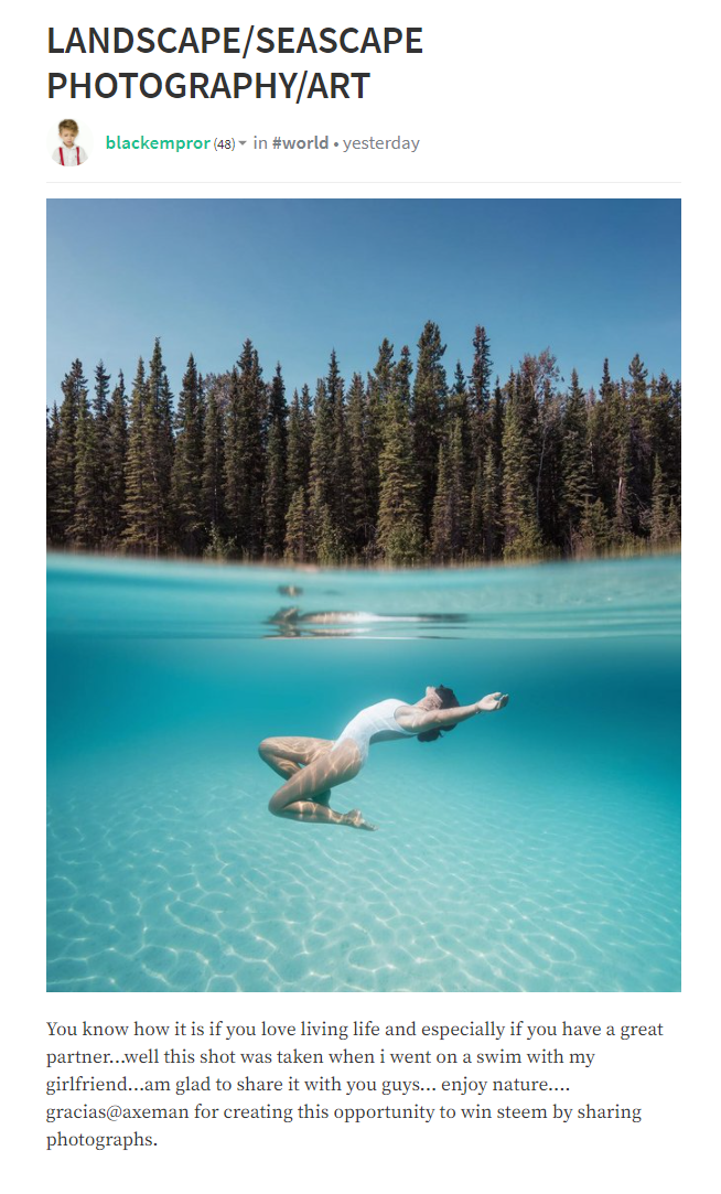 You know how it is if you love living life and especially if you have a great partner...well this shot was taken when i went on a swim with my girlfriend...am glad to share it with you guys... enjoy nature.... gracias@axeman for creating this opportunity to win steem by sharing photographs.