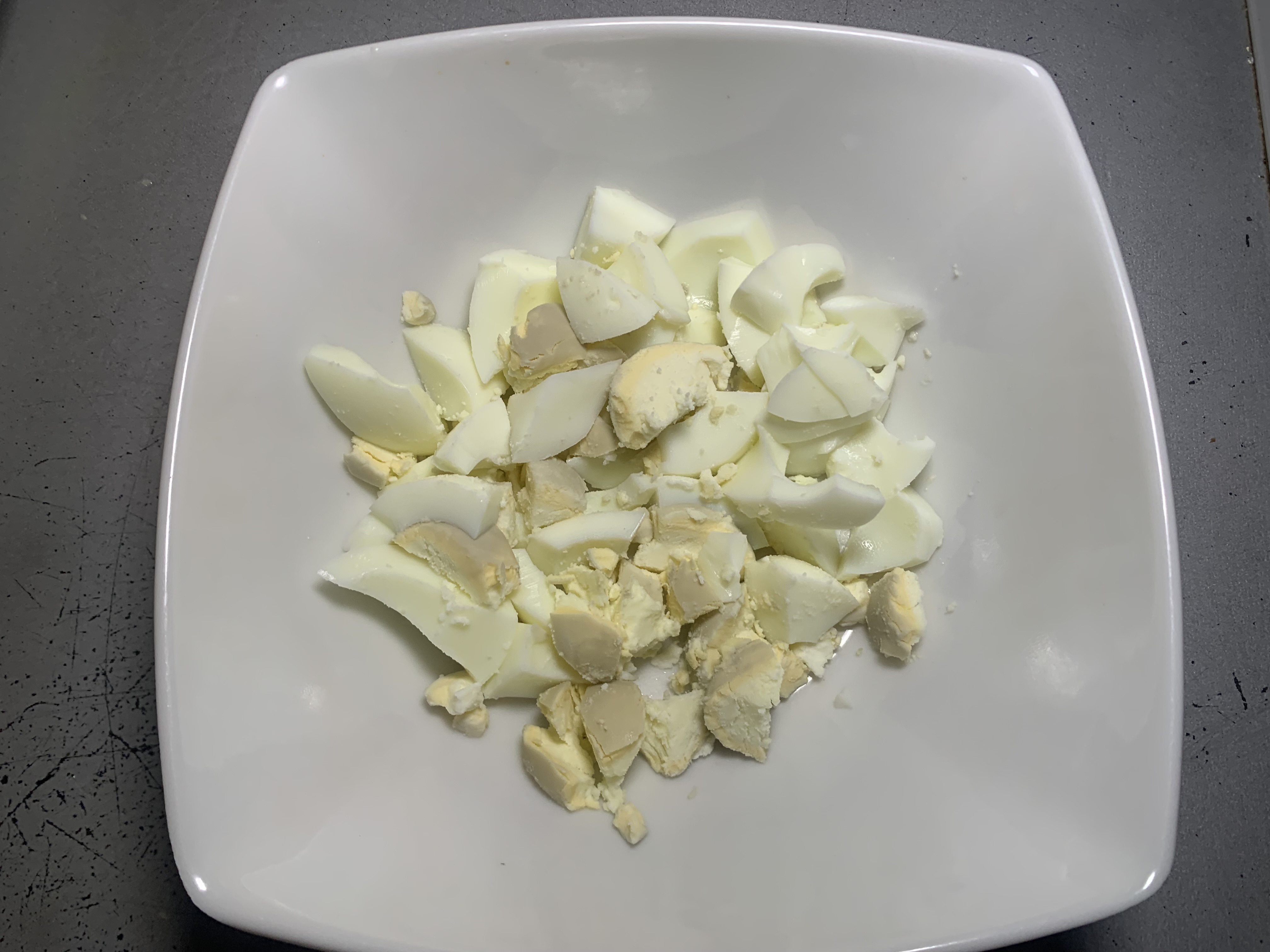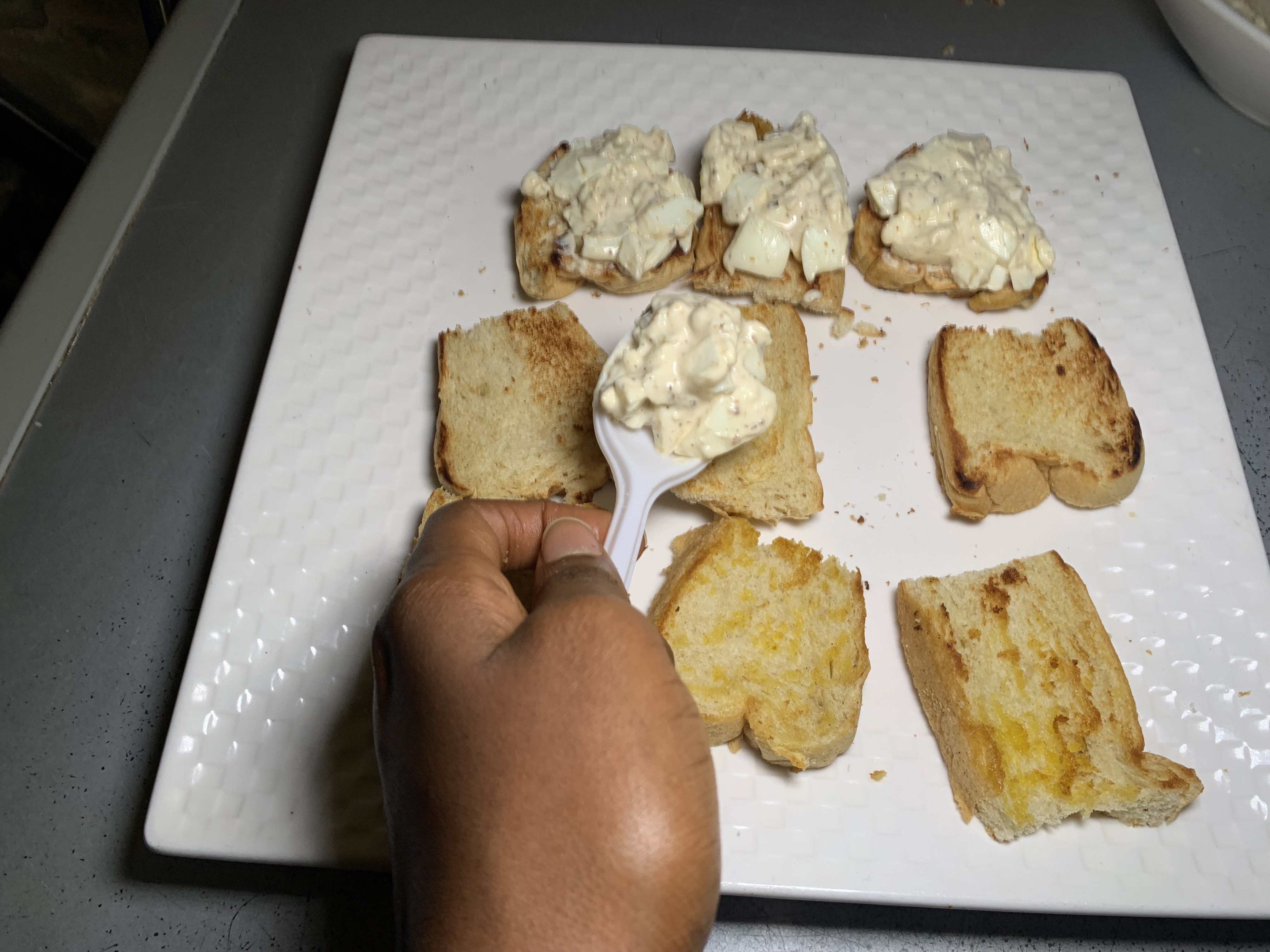 I proceeded to spreading one tablespoon egg salad on each of the toasted bread.