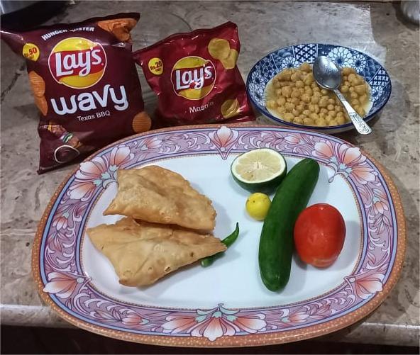 This is called "Samosa Chaat". Its a type of salad in which we used samosa with salad items and chickpea. Samosa means "stuffed potato patties". Pakistani and Indian people love to eat "Samosa" with tea or curd sauce or ketchup. Anyways Let us see the recipe and ingredients of "Samosa Chaat". Here we are making chaat for 2 to 3 persons. It is really delicious.