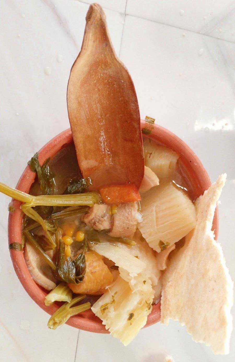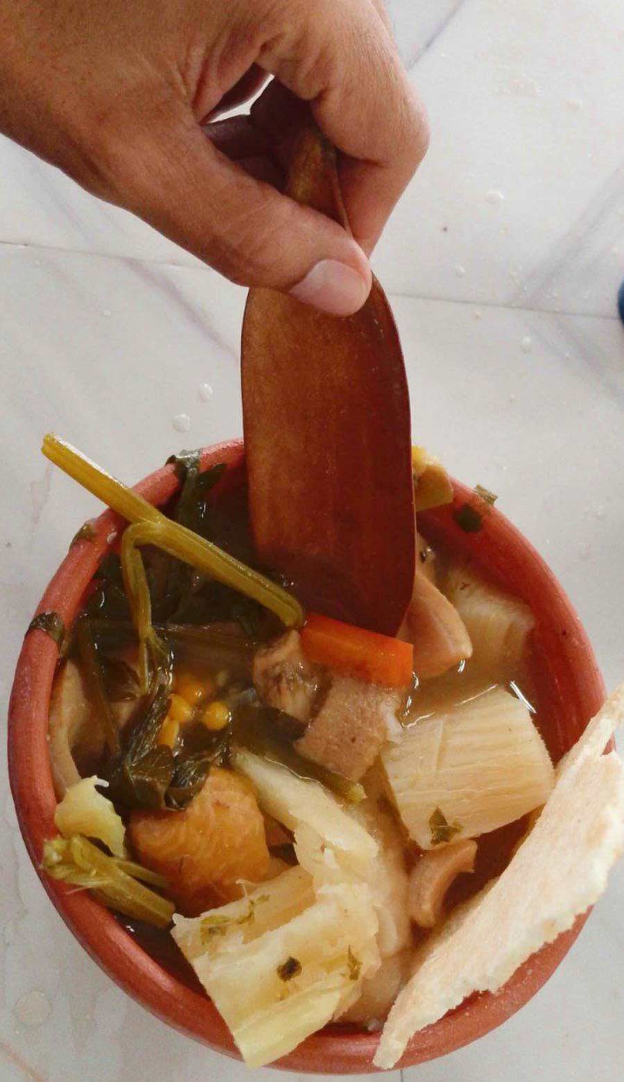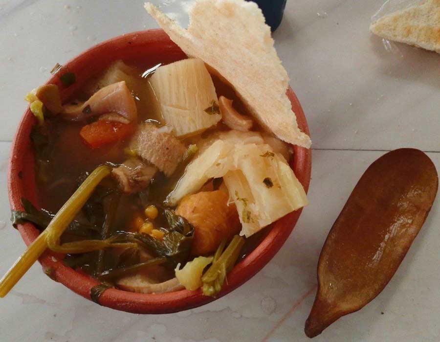 The soup was created with local ingredients, very Creole-style, with unmistakable flavors: cilantro, plantain, sweet and tender corn, fresh meat, the ocumo (ocumo tree), and other spices with delicate aromas. The moment of eating the soup involved mastering the wooden utensil that served as a spoon, fork, and knife.