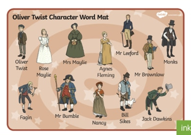 They were Oliver Twist, chimneysweeper Gamfield, Artful Dodger, Noa Claypole, Bumble, Fagin, Monks, Mister Brownlow, Maylie and Rose, Sikes, Nancy.Best quotes.
