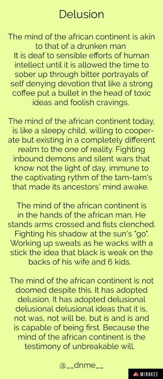Here is my latest work on the platform. It is a spoken word poem, to which I will upload a performance as soon as I do perform it at the local poet's place (BAT center in Durban ZA).