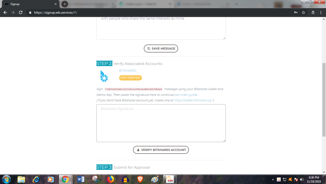 make a bitshares account if you dont have then veify your bitshares accout using the red code above the box copy it then go to signed message then copy the sign message below it