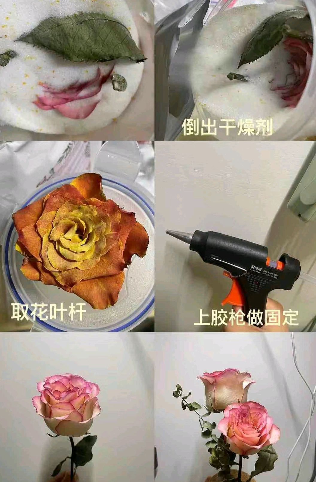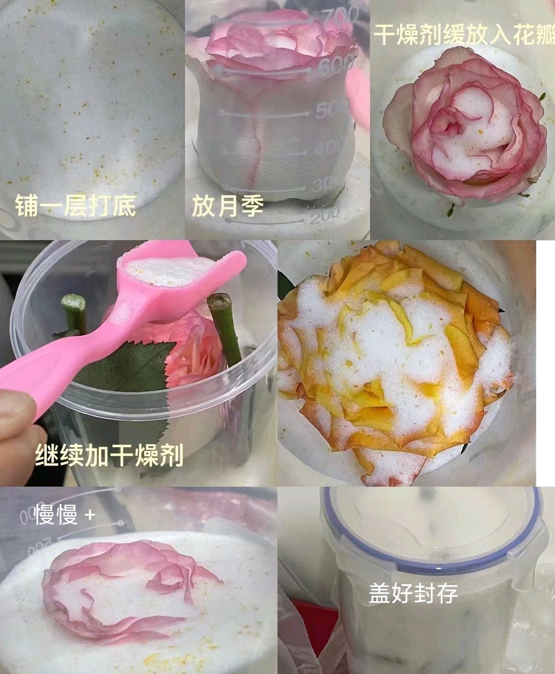 将购买的干燥剂,倒入容器中,将鲜花剪成花骨朵放入容器中,保存三天左右打开就可以啦。