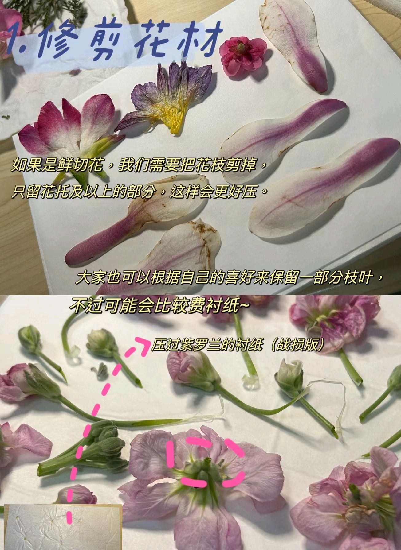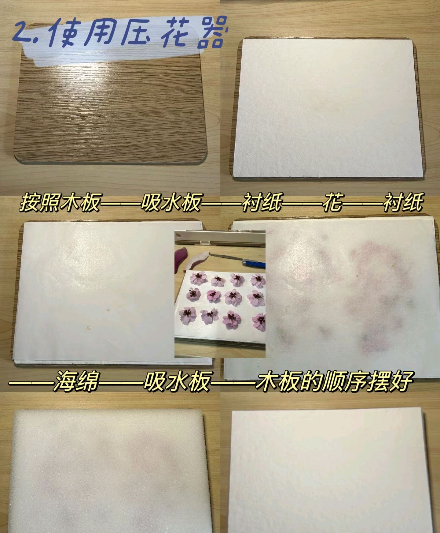 第三步:压花板放最底下,接着放吸水纸,接着放衬纸(带剪好花瓣),最上面放海绵