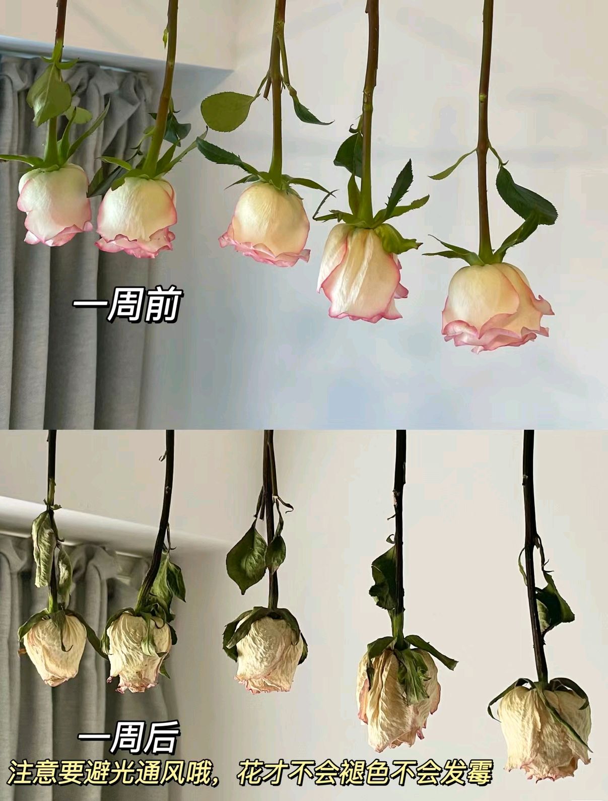 首先把一整束鲜花拆开包装,然后分开一朵一朵,下一步找一些小绳子(最喜欢麻绳)将一朵鲜花颠倒挂在家里的通风口,大概3-7天之后就会变成非常漂亮的干花啦。