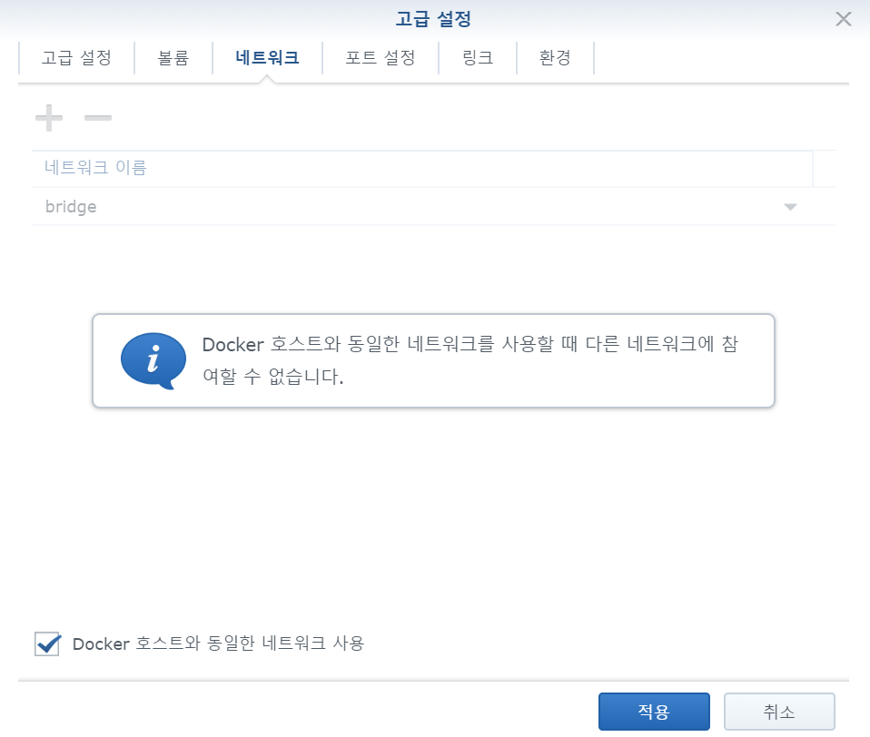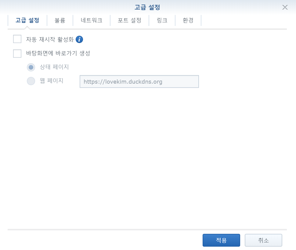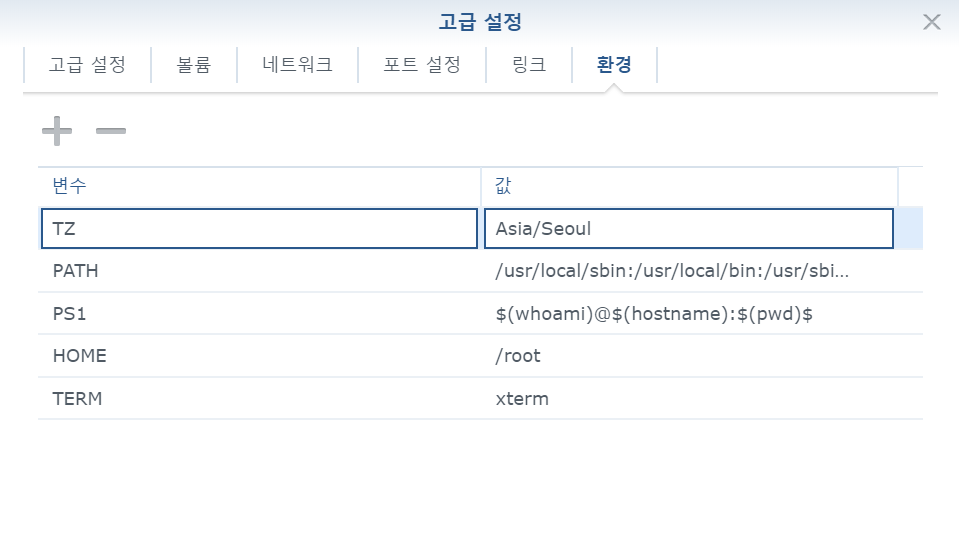 볼륨탭에서 다음의 두 폴더를 설정합니다. 폴더는 사전에 생성합니다.