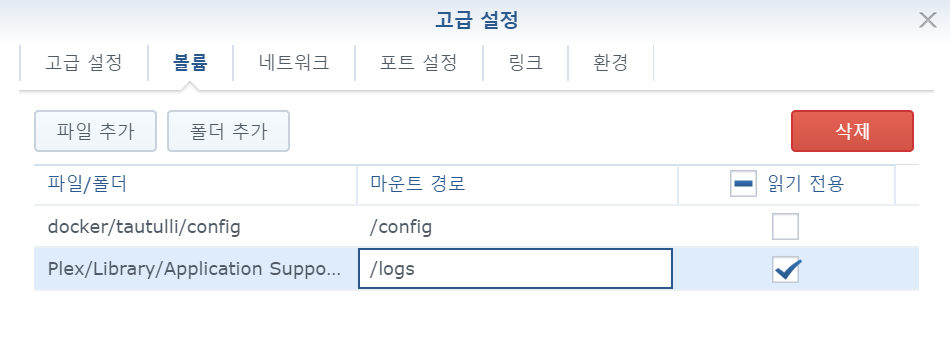 Plex/Library/Application Support/Plex Media Server/Logs 는 /logs로 (Readonly 체크 필수)