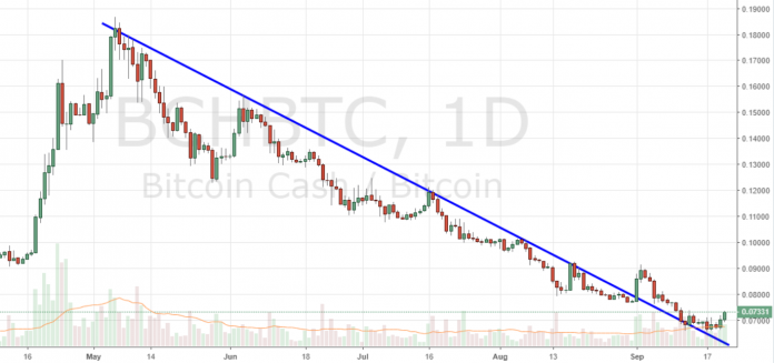 The BCH/BTC rally appears to coincide with a bounce of the upper-side of the descending trend line that has guided price action since May. BCH currently has a market cap of $8.34 billion and a dominance of 3.75%.