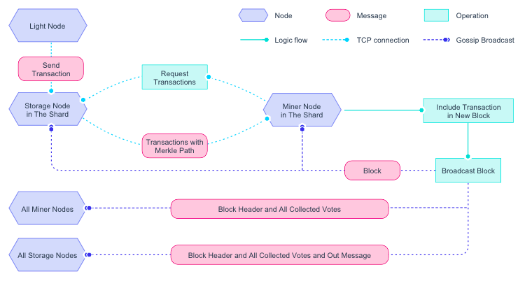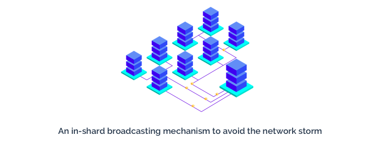MultiVAC adopts a new in-shard broadcasting mechanism that confines data transmission within shards, and in turn, lowers the transmission pressure within the network and speeds up transactions. Once a miner completes block confirmation, information about the new block is broadcasted within the shard and only block headers are broadcasted to the entire system. As each header only takes up 400 bytes of space, even when MultiVAC reaches a TPS exceeding a million, it only requires 5–20Mbps of network bandwidth. This solution greatly reduces the hardware requirements on nodes, conserves transmission resources, and prevents the occurrence of network transmission storms that clog the network.