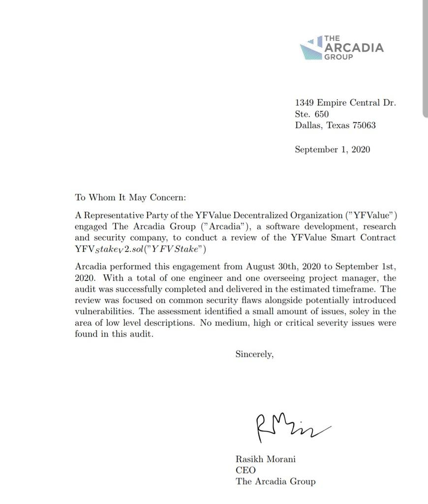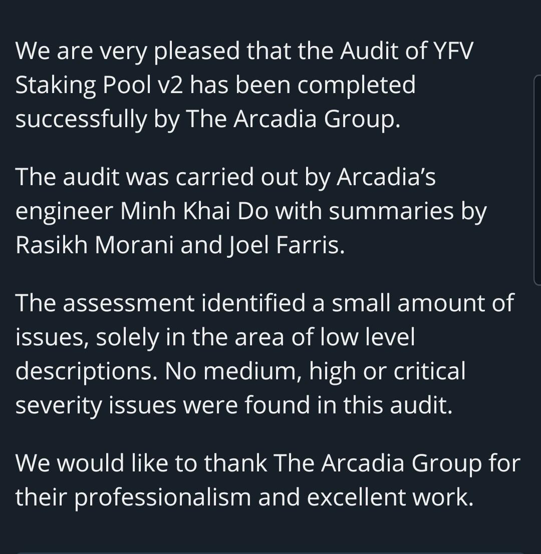 The devs are very transparent and the smart contracts passed their first audits. This is one of the reasons why I yieldfarm YFV and why I am bullish, but please be aware that this is still risky and you can lose all your funds.
