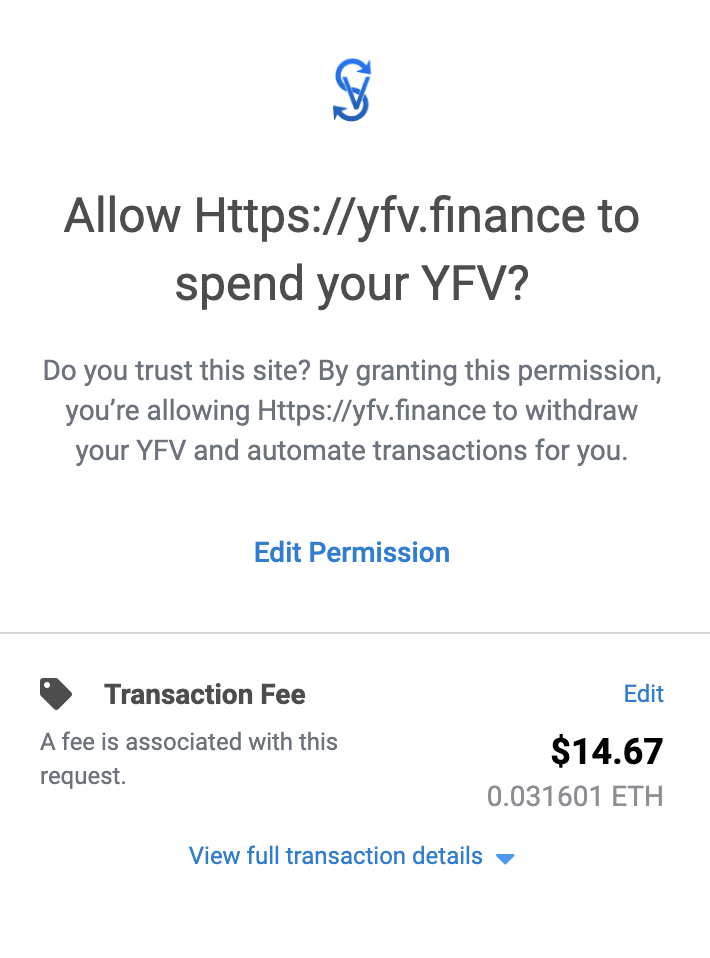 Lastly, you need to click on the "stake" button at the bottom and confirm the next 2 transactions. The first one is to allow YFV.finance to spend your YFV tokens and the second one is to actually stake your tokens. The GAS fees are extremely high now, due to network congestion. But if you are staking with a minimum of 90 YFV, that shouldn't be a problem. You'll earn it back in no-time.