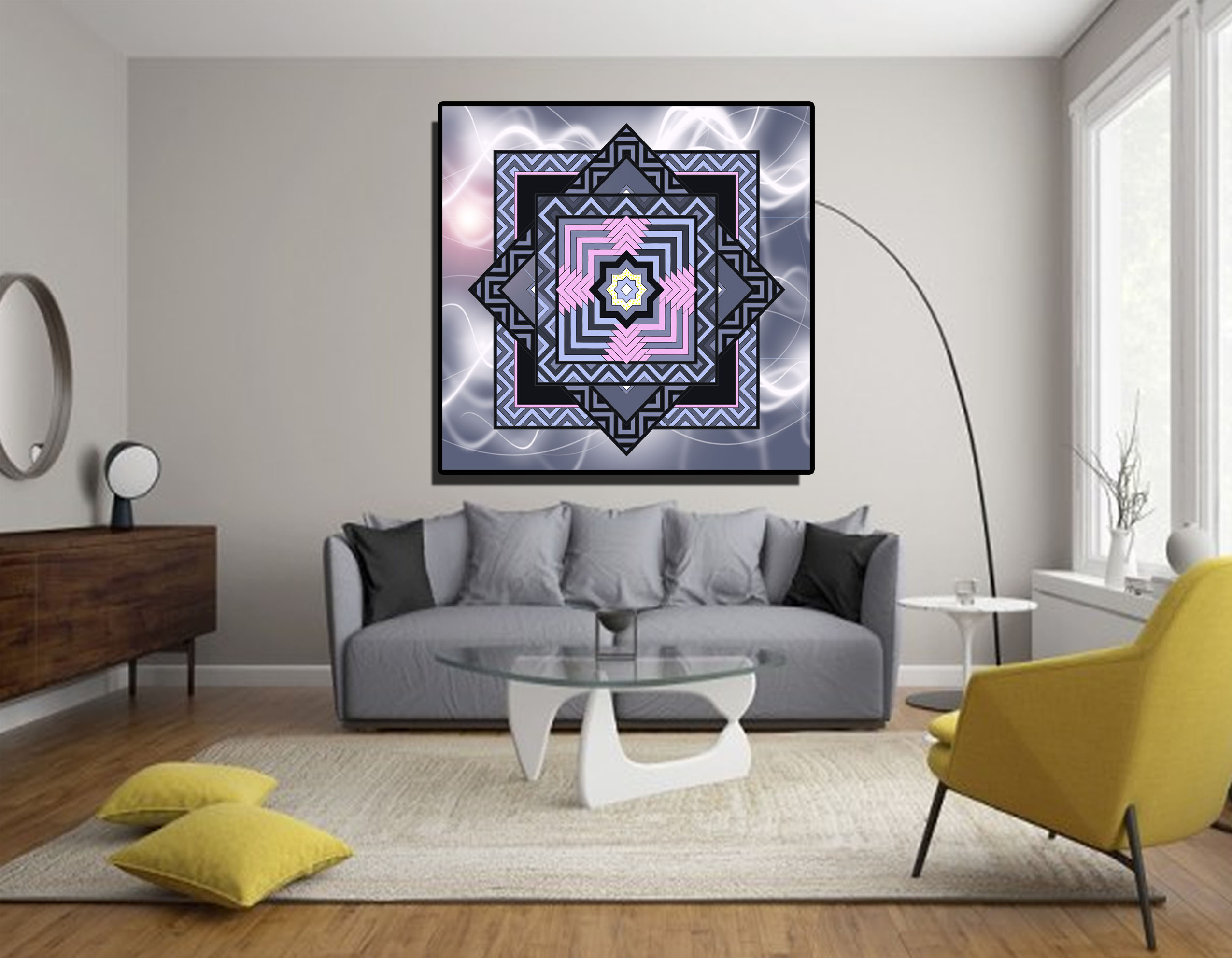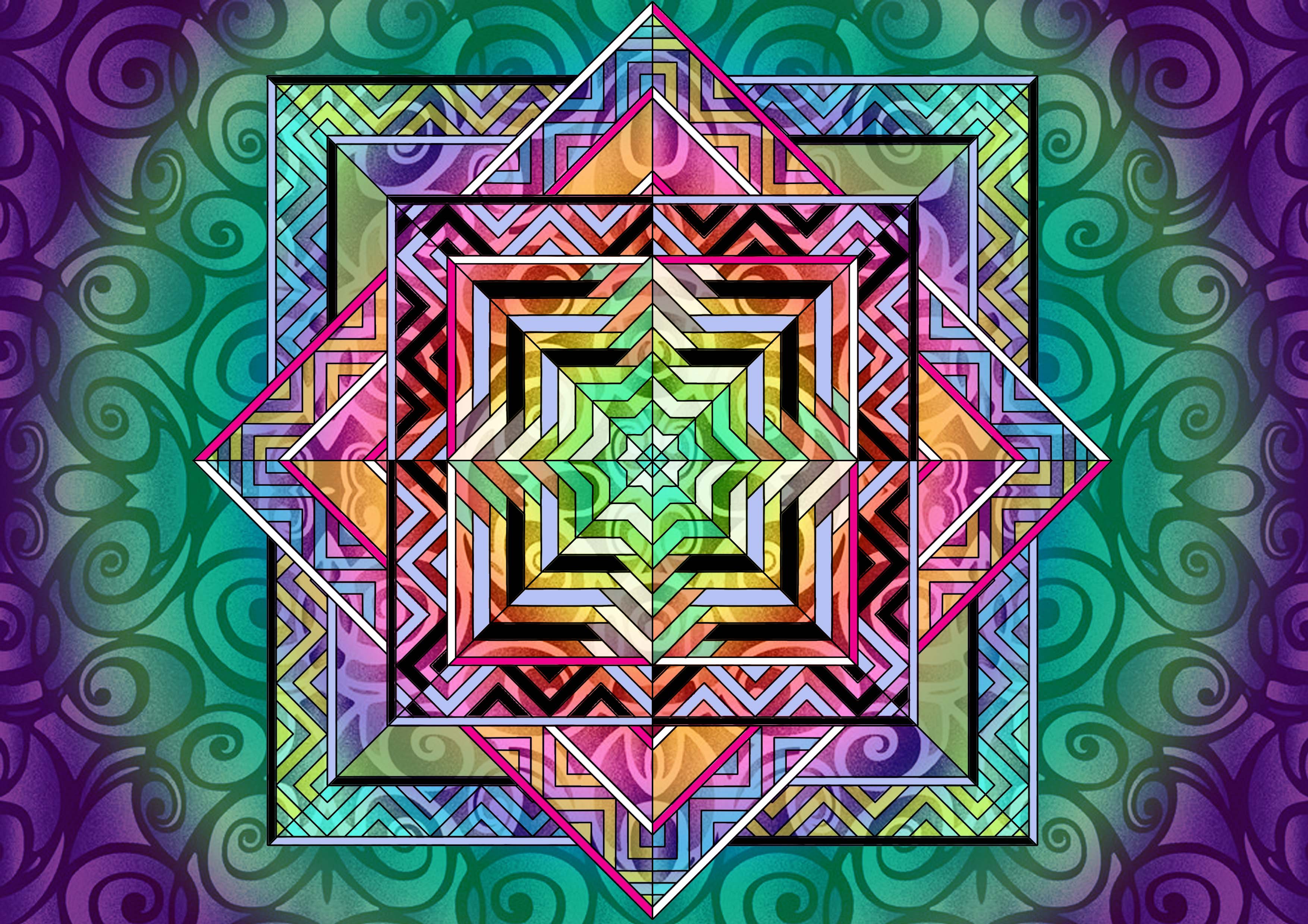 I picked this one as the winner because of the super colourful rainbow pattern created by the stained glass effect of the coloured sections. The block filled sections help divide the transparent patterns and adds to the glass texture. The combination of their own Zen Rainbow inspiration and my Tesseract inspiration shines through as a beautiful prism of light!