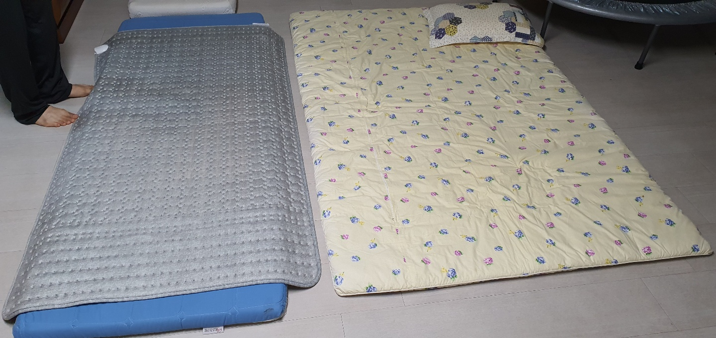 두 사람이 깔고 덥고 잔 이불과 요다.