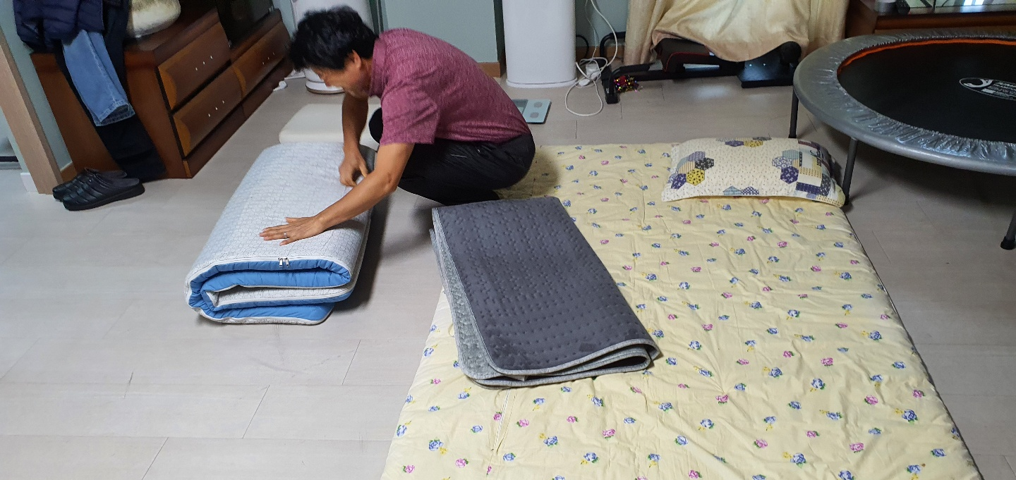 나도 일어났어요 하기에 잘 잤냐고 인사를 건네며 보니 잠자리를 개고 있는 게 아닌가, 아니 기록으로 남겨야 하는데 하며 나가니 벌써 이불은 다 개었다.