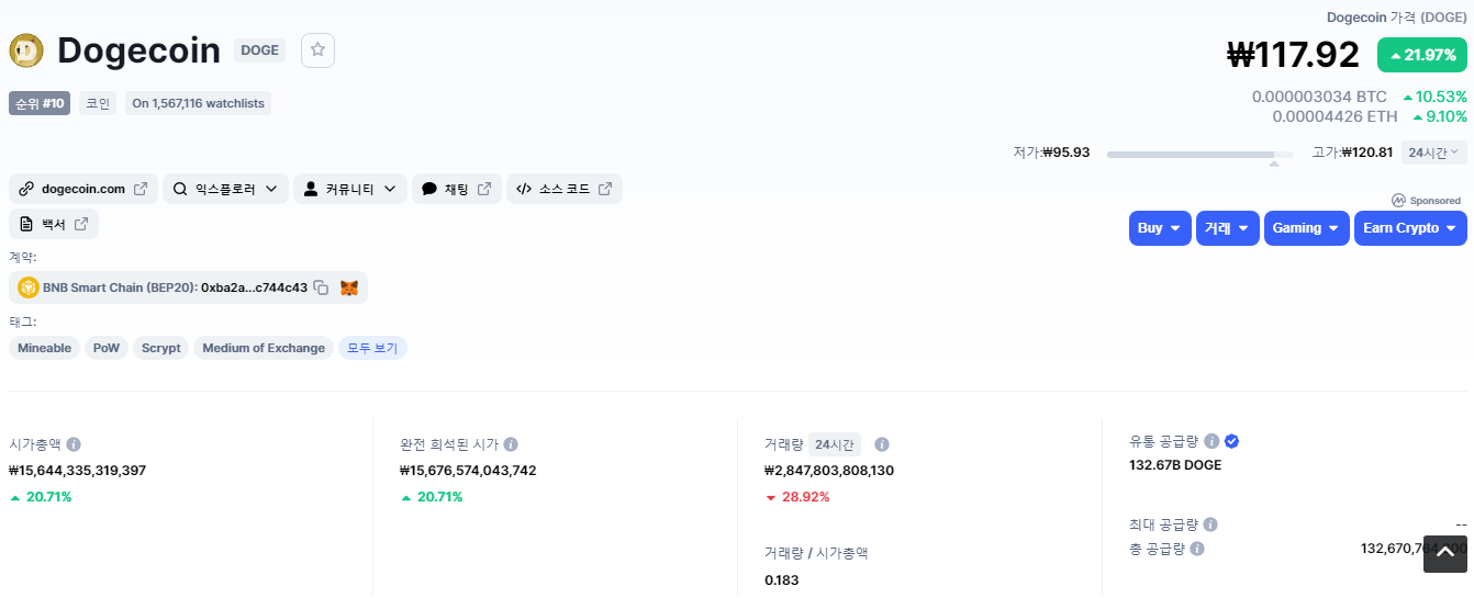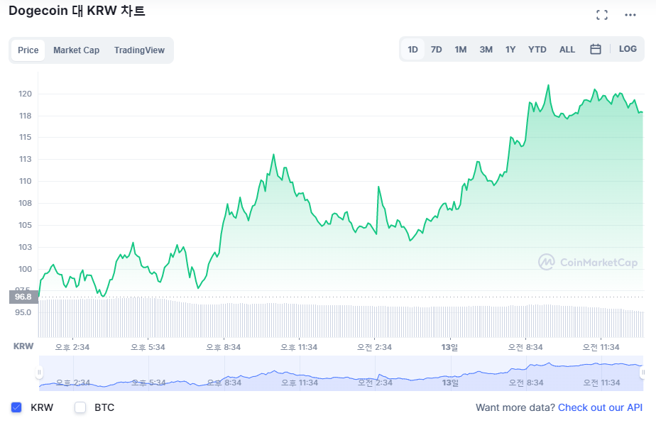 오늘의 Dogecoin 실시간 가격은 ₩118.16 KRW이며 24시간 거래량은 ₩2,868,711,450,678 KRW입니다. DOGE 대 KRW 가격을 실시간으로 업데이트합니다. Dogecoin은(는) 지난 24시간 동안 21.94 상승했습니다. 현재 코인마켓캡 순위는 #10위이며, 실시가총액은 ₩15,676,574,043,742 KRW입니다. 순환 공급량은 132,670,764,300 DOGE코인입니다 및 최대 공급량을 이용할 수 없습니다