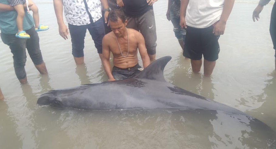 A 2 meter whale was found stranded on the shore of Kuala Leuge Village, Peureulak District, East Aceh Regency, Aceh Province, Indonesia, Monday (02/03/2020).