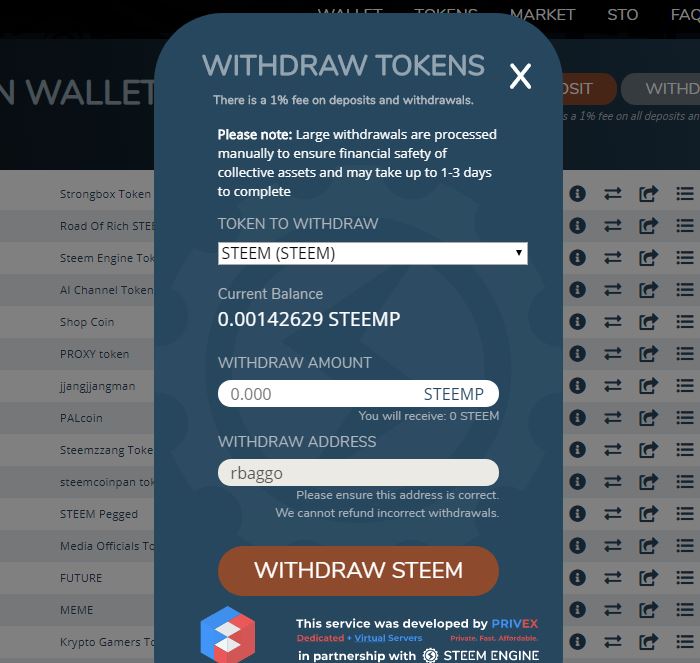 반대로 출금도 간단합니다. 토큰들을 팔면 Steemp로 변환이 되는데요. Withdraw를 누르면 스팀(Steem)으로 출금이 되요. 이 때도 1% 수수료가 있습니다.