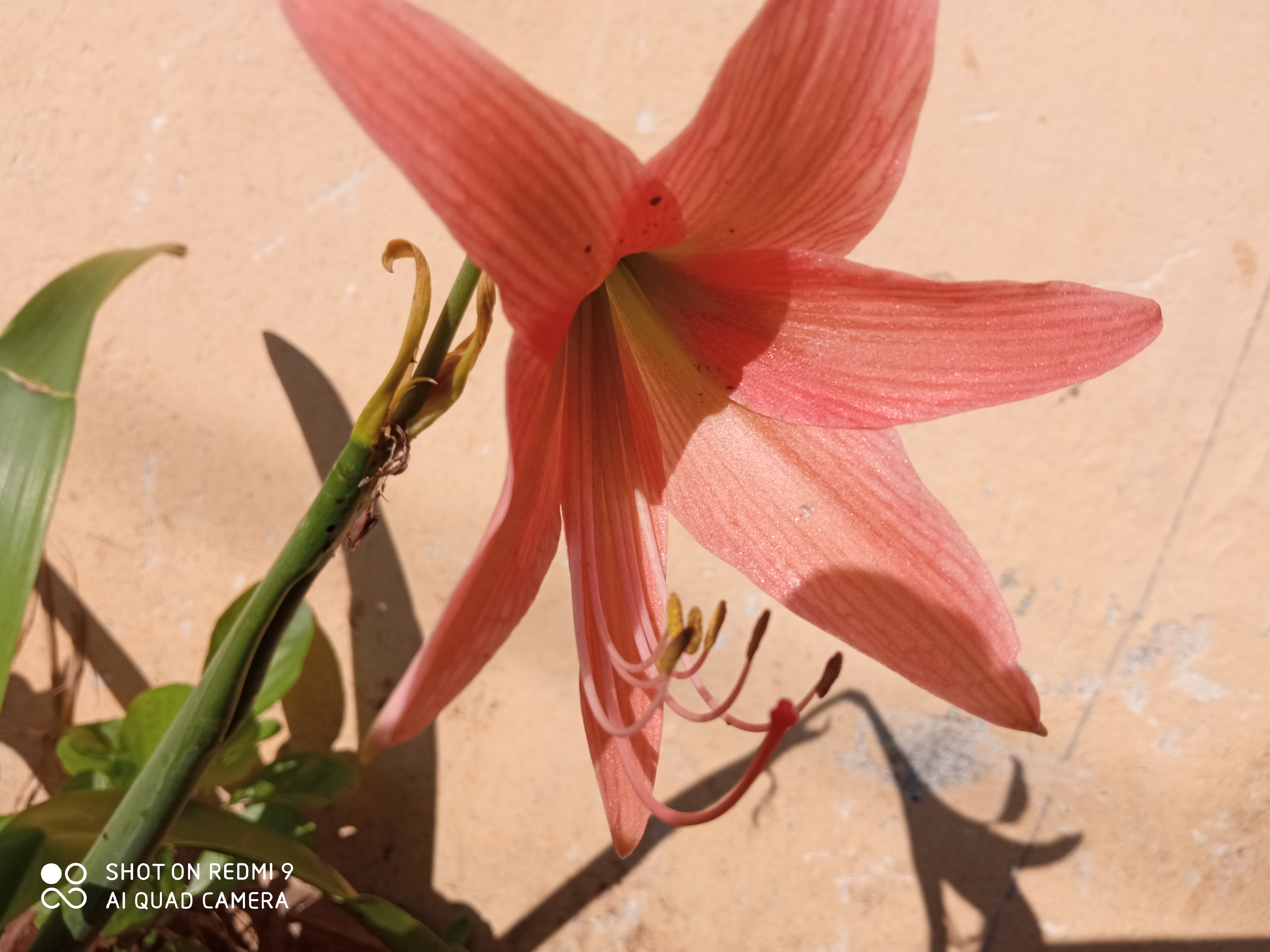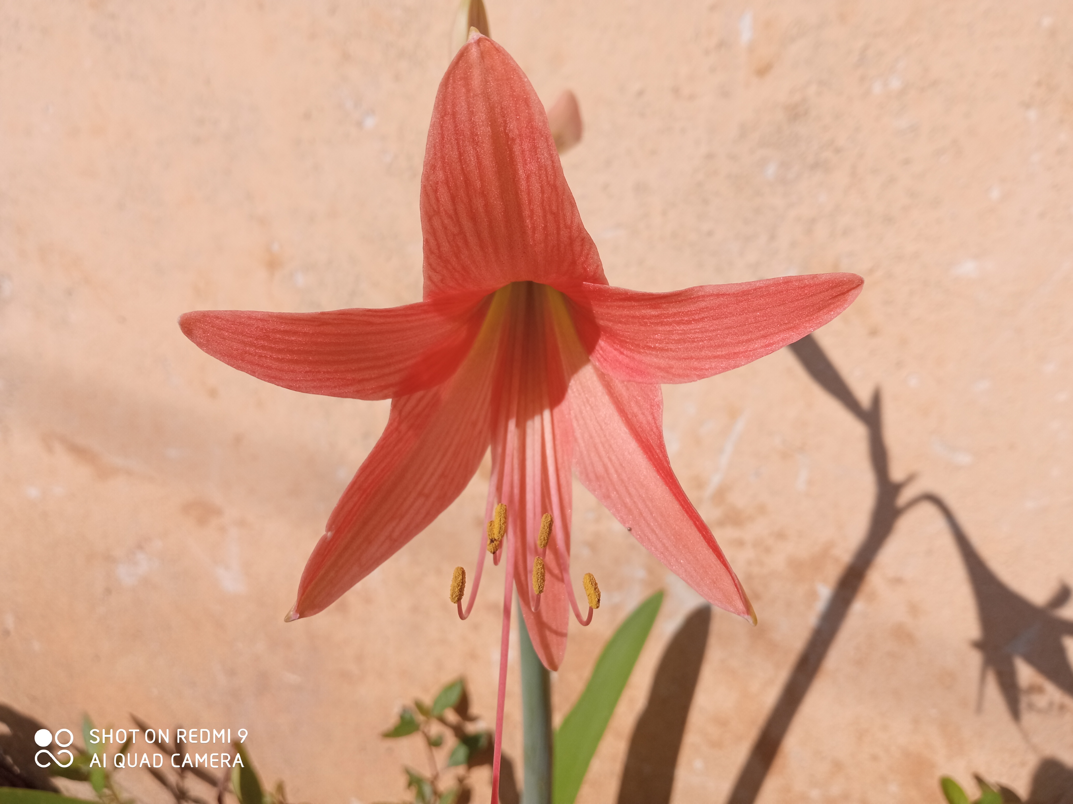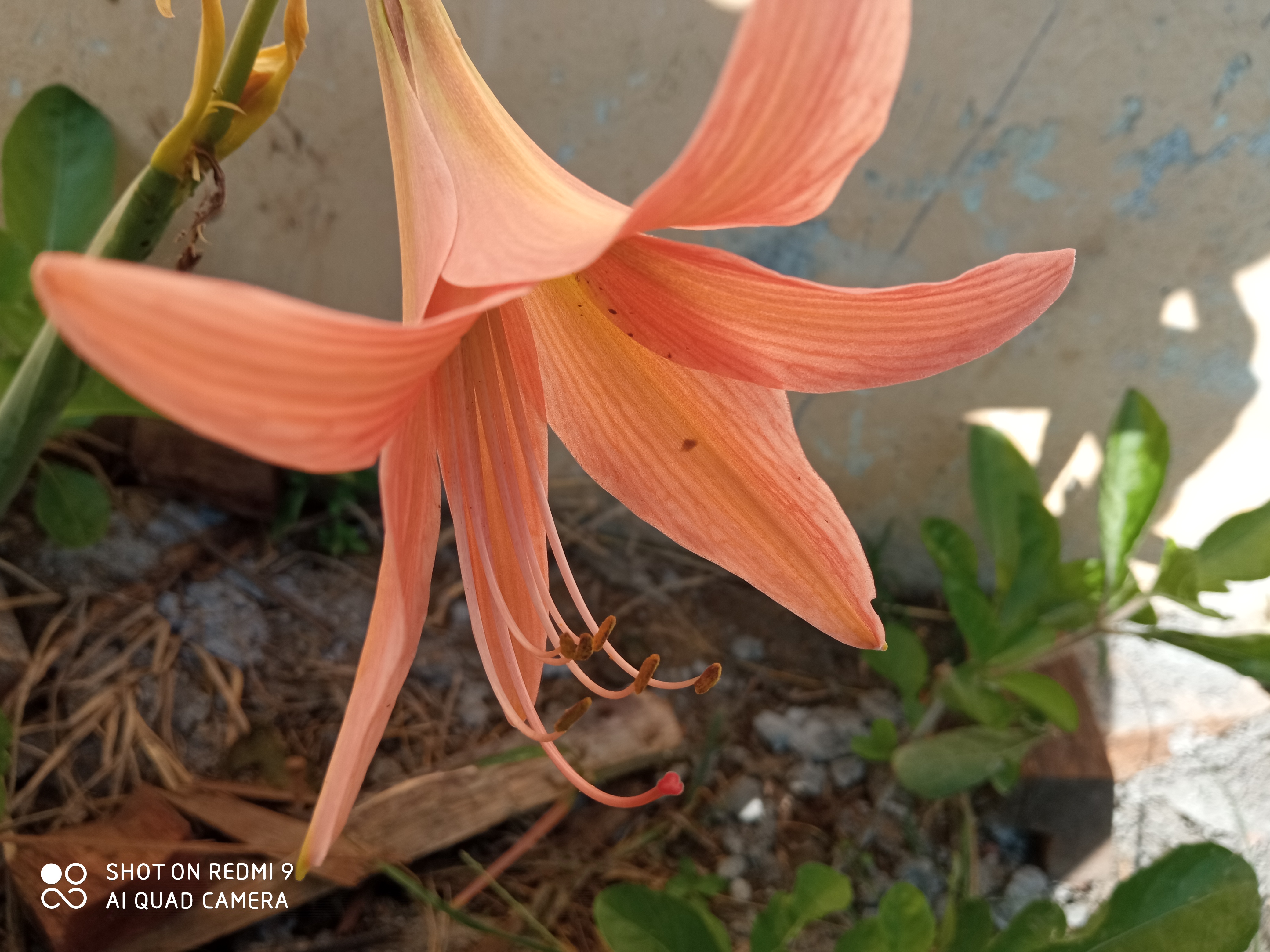 Sekuntum bunga terompet merah mekar tampak tepat di dinding dekat dinding beton belakang kelas dibawah terik matahari hari seolah memberi tahu saya "jadikan aku sebagai postingan mu" 😀