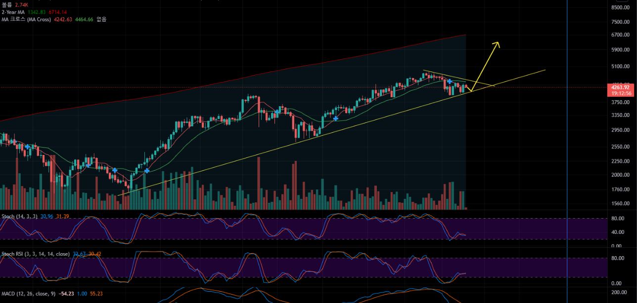 이더리움 단기 예상steemCreated with Sketch.noochinoochi (45)in #zzan • 4 years ago 오늘 내일 음봉 예상. 25일까지 최저가 4.1k 부근. 26일 부터 양봉 신호로 올라갈 것으로 예상됩니다. #aaa #dblog #sct