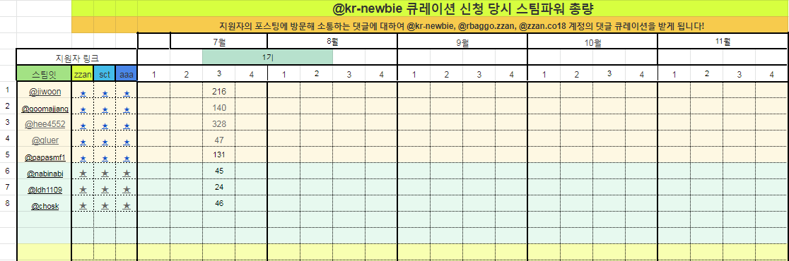 - 이외의 모든 보상은 파워업하여 공공 큐레이터 계정인 @kr-newbie에 임대할 예정입니다.(매주마다 정산하여 일괄처리)