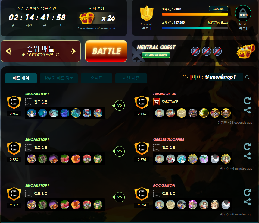 [Steemmonsters] 부캐의 Daily Mission 수행기smonkstop1 (62)in #zzan • 5 years ago 오늘의 Daily Mission은 중립 덱 없이 3승 하기 입니다. 미션 완료하였습니다. 보상으로 받은 상자를 열어 보니 .. 이상입니다. #spt #iv #upfundme #neoxian #steemace #dblog #liv #marlians
