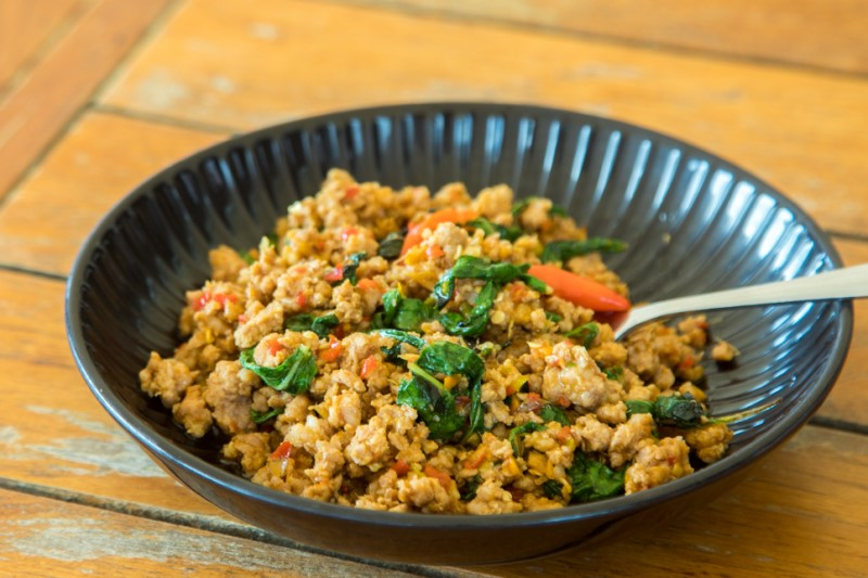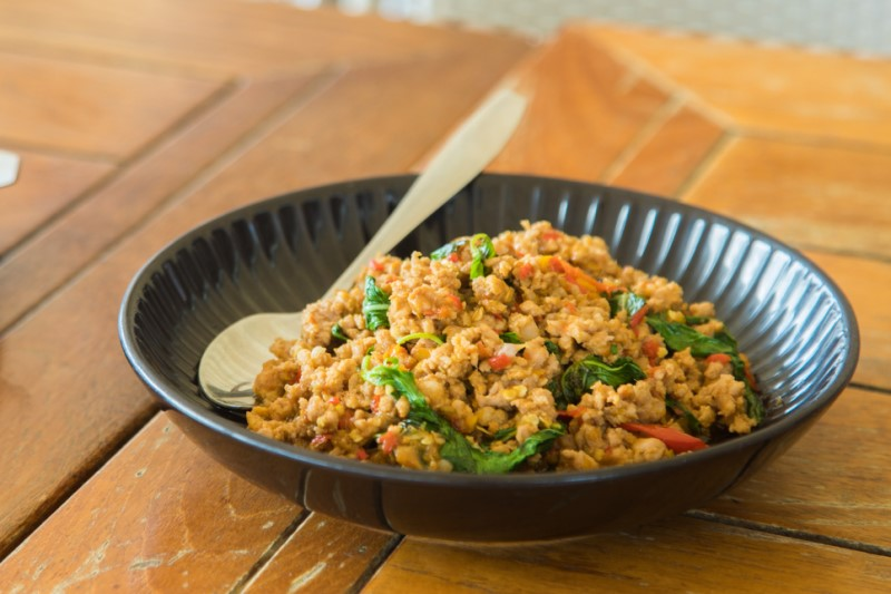 Stir fry with minced pork, basil leaves, chilli and garlic