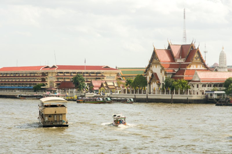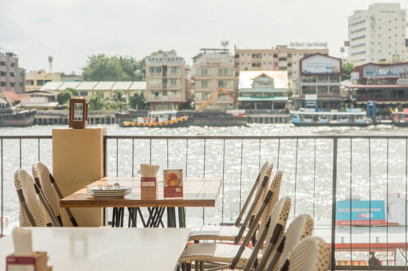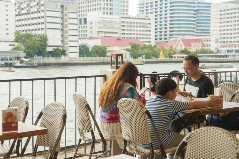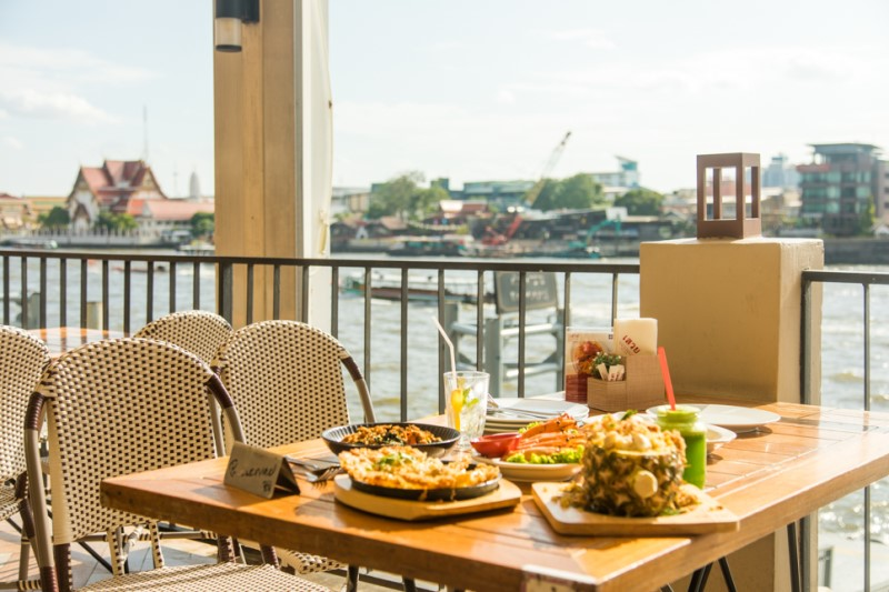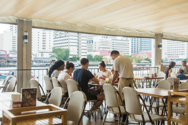 You can eat while watching the water bus and water taxis coming and going in front of the river!